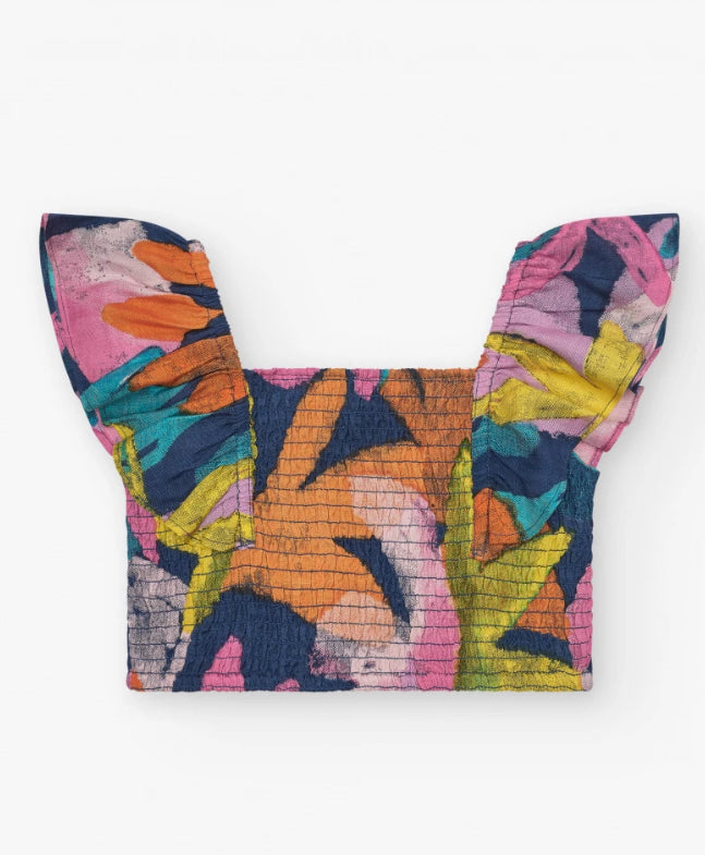 Blusa para niña con estampado tropical multicolor. Cuenta con un ajuste nido de abeja en el cuerpo y tirantes anchos. Colección Sun Lover. Falda para niña con estampado multicolor y cintura elástica fruncida para un ajuste perfecto. Colección Sun Lover.
