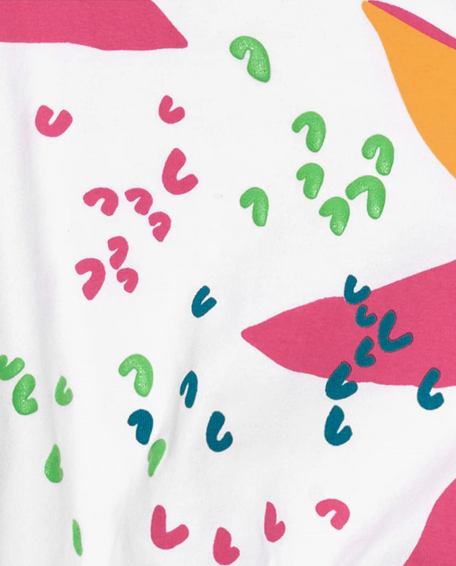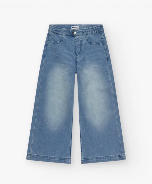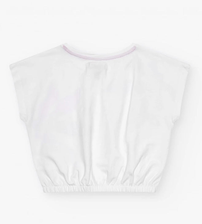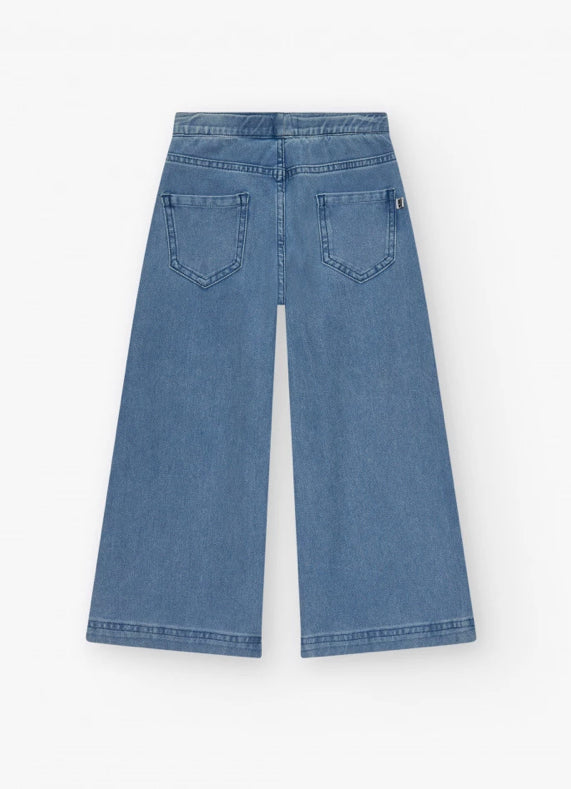 Camiseta de manga corta para niña en color blanco, diseñada con estampado floral en colores rosa, morado, naranja y verde. El diseño incluye un dobladillo elástico para un ajuste cómodo. Pantalón para niña en denim con diseño de pierna ancha y talle alto, cierre frontal con botón y cremallera. Incluye bolsillos delanteros y traseros.