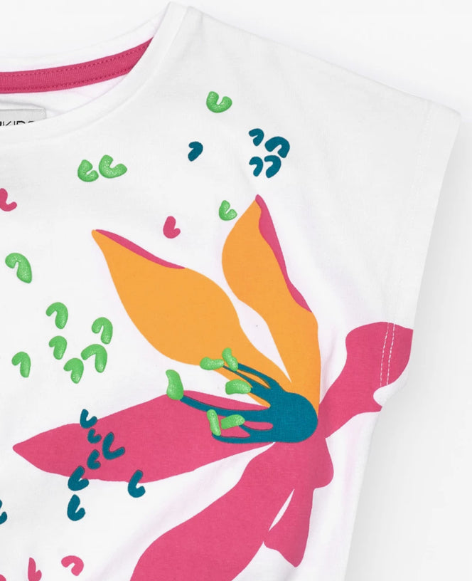 TucTuc NK Tropicale Vibes Conjunto Niña Camiseta en blanco de manga corta y estampado floral Pantalón en denim con cremallera y bolsillos