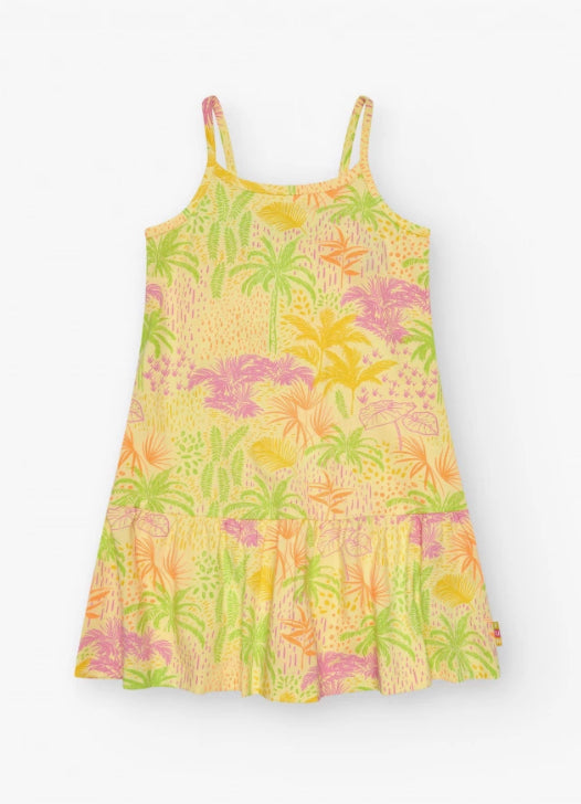Vestido para niña de color amarillo, con tirantes finos y estampado tropical en tonos amarillos, verdes y rosas.