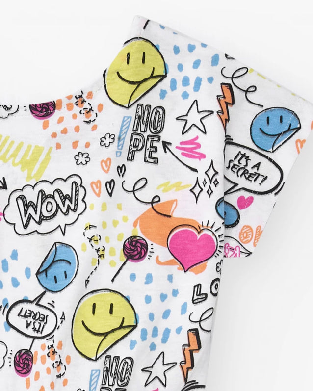 Vestido para niña en color blanco, decorado con estampado de emoticonos, corazones y palabras. Incluye un cinturón decorativo negro con detalles brillantes.