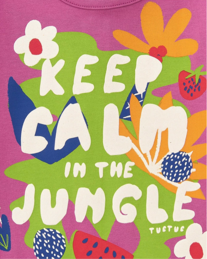 Ref.11389275. Conjunto de Camiseta de punto para niña en color lila, con estampado tropical que incluye flores, frutas y el mensaje "Keep Calm in the Jungle". El diseño incluye cierre en la parte trasera para mayor facilidad al vestir. Ref.11389266. Leggings de punto para niña con estampado de frutas tropicales sobre un fondo verde. Colección Vacay Feelings.