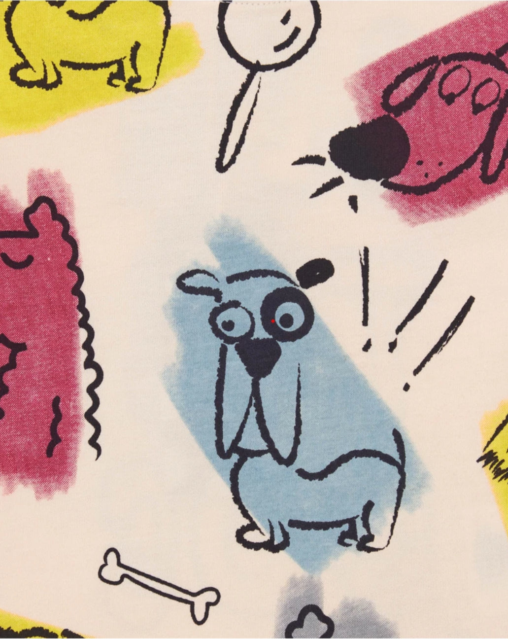 conjunto Camiseta de manga larga para niño en color beige claro, confeccionada en suave tejido de algodón. Destaca por su divertido estampado de perros en colores vibrantes como rojo, azul y amarillo, tanto en la parte delantera como en la trasera, donde aparece también la palabra “Gentle Dog”. Pantalón Jogger Felpa Azul Marino