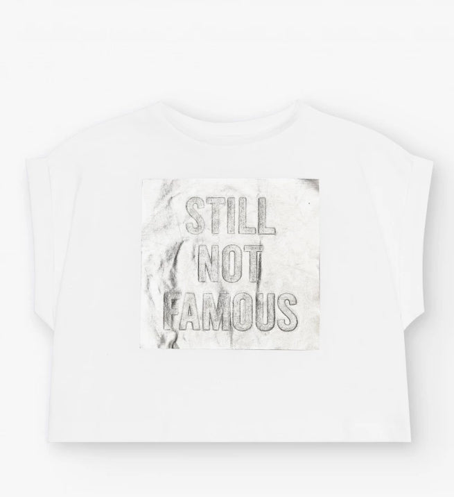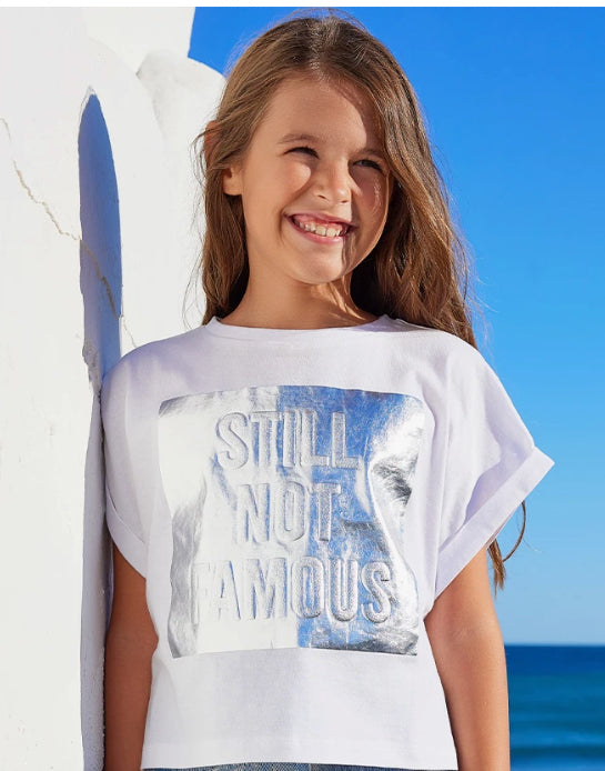 Camiseta para niña de manga corta de color blanco y estampado metálico "Still Not Famous" en la parte frontal. Colección Strawberry sorbet.
