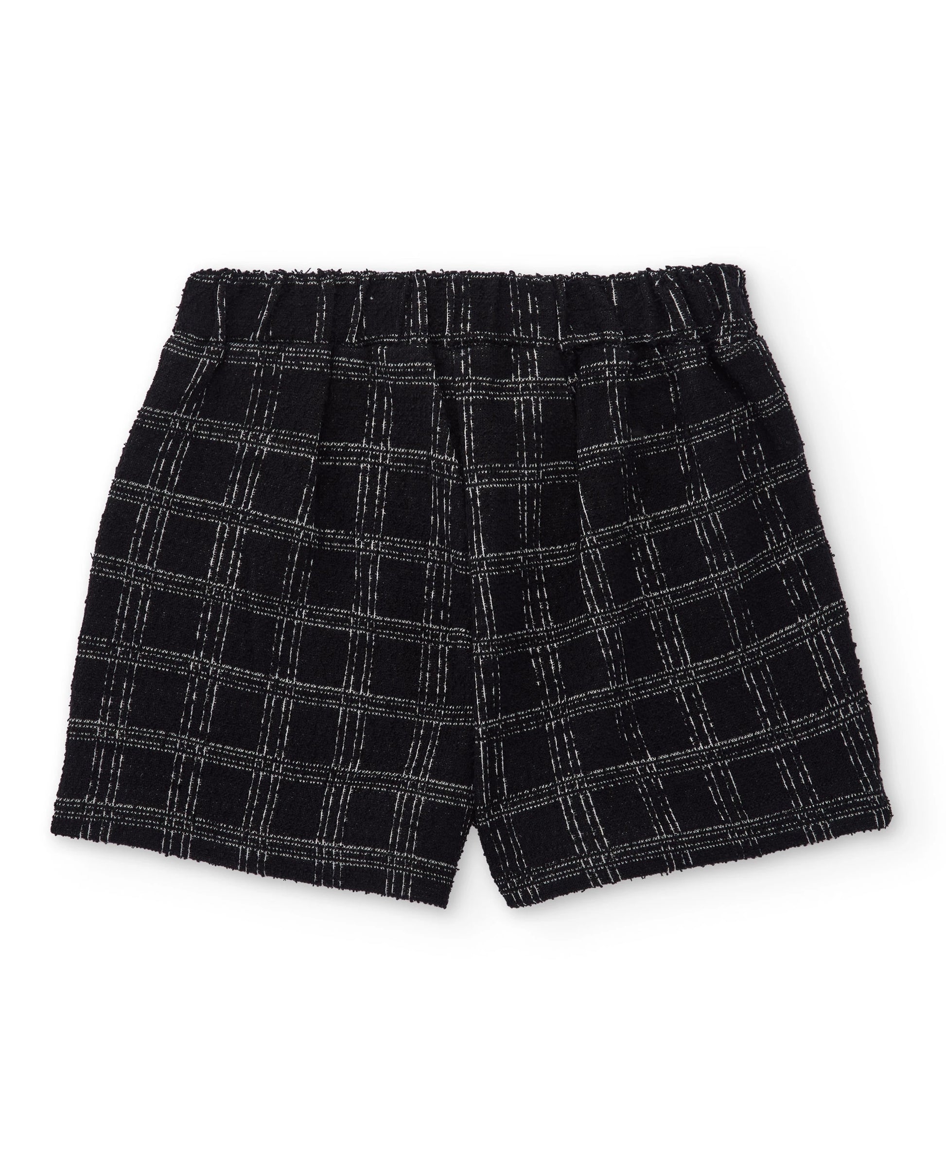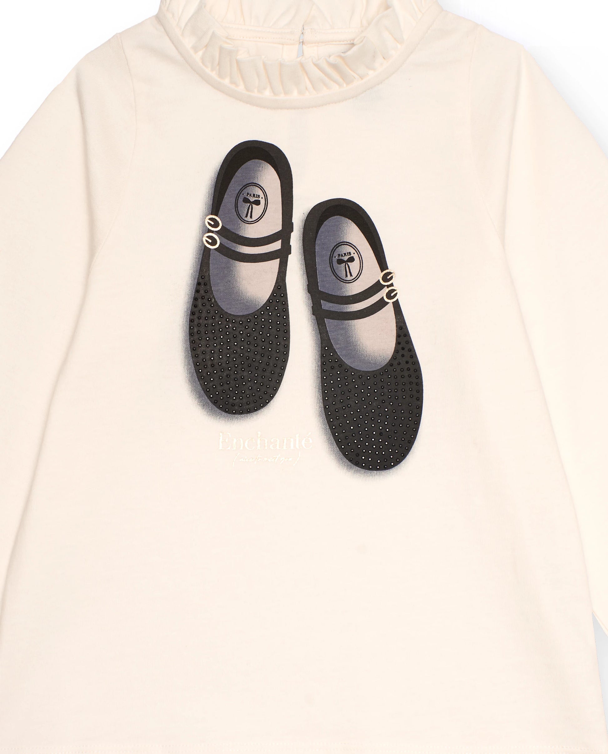 Conjunto Camiseta de manga larga para niña en color crudo, confeccionada en tejido suave y con un delicado diseño de cuello subido y puños fruncidos. El frontal presenta un original estampado de bailarinas con zapatos aplicados en relieve. Pantalón de niña en color negro con estampado de cuadros grises, confeccionado en tejido tweed