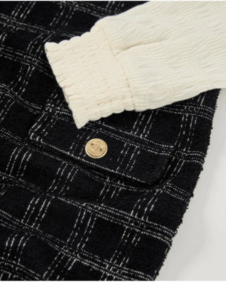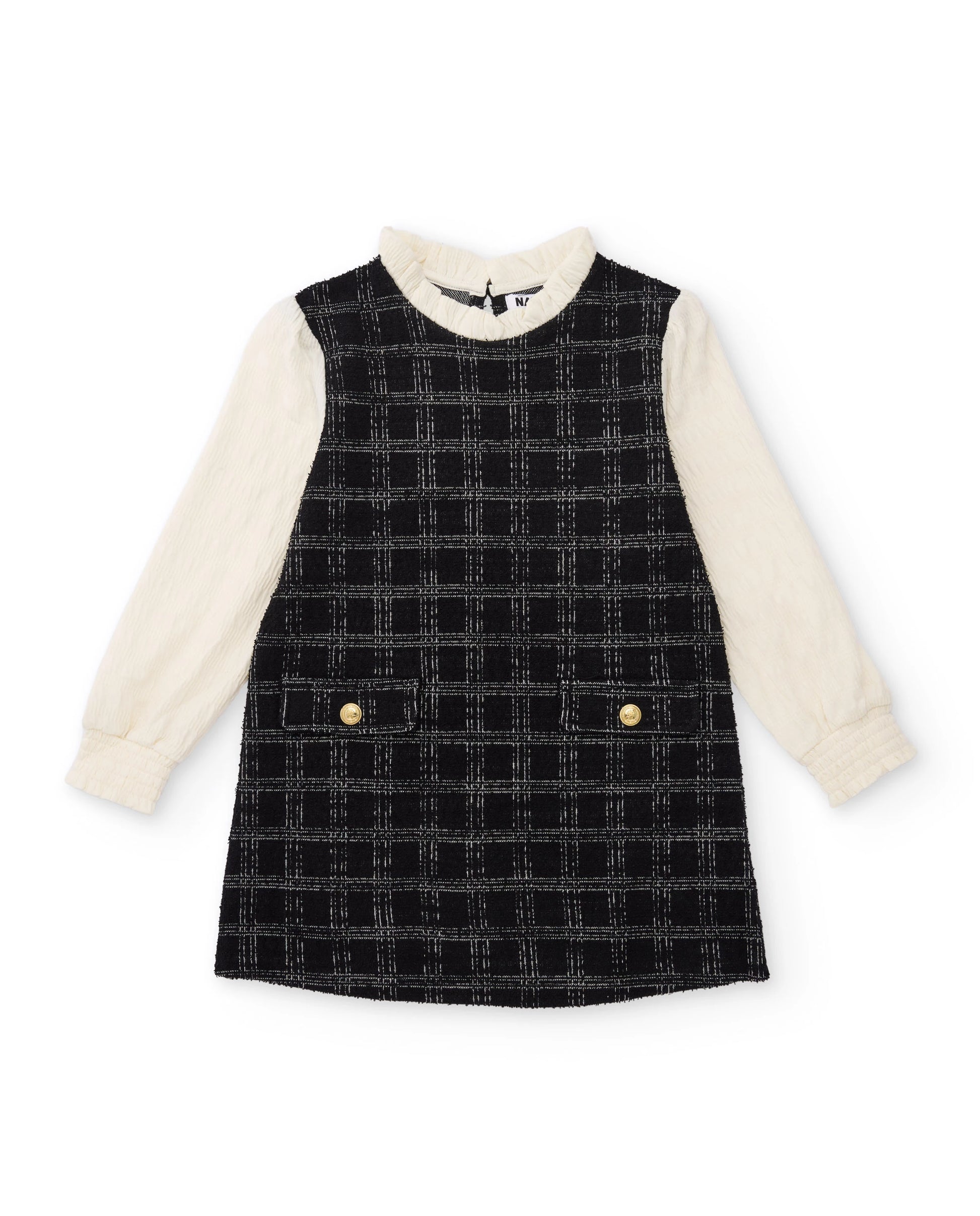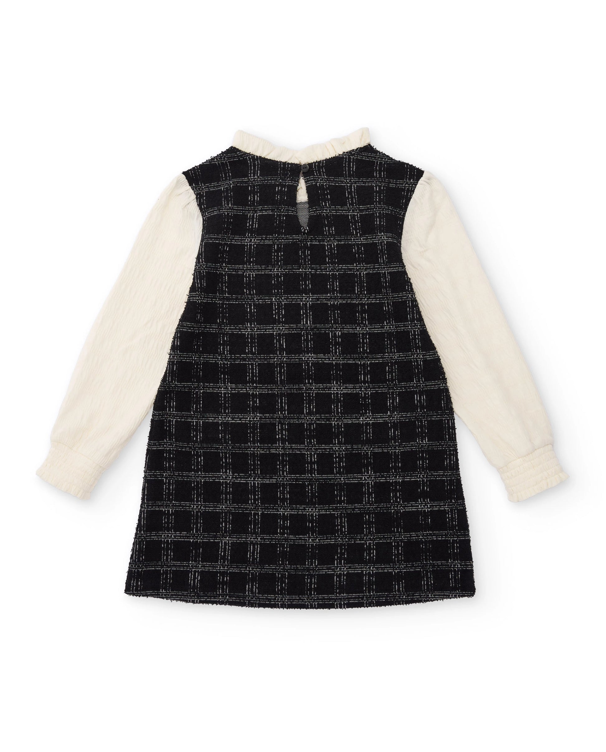 Vestido para niña de estilo elegante, con cuerpo en tejido de cuadros negros y grises, y mangas largas en contraste de color crudo con textura ligera. Presenta cuello fruncido, dos bolsillos decorativos con botones dorados en la parte delantera y cierre trasero con botón.