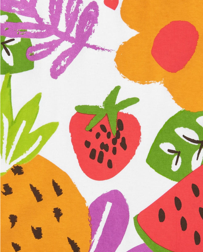 Vestido de punto sin mangas para niña de color blanco con estampado tropical de frutas y flores. Incluye botones decorativos en el hombro para facilitar su puesta.