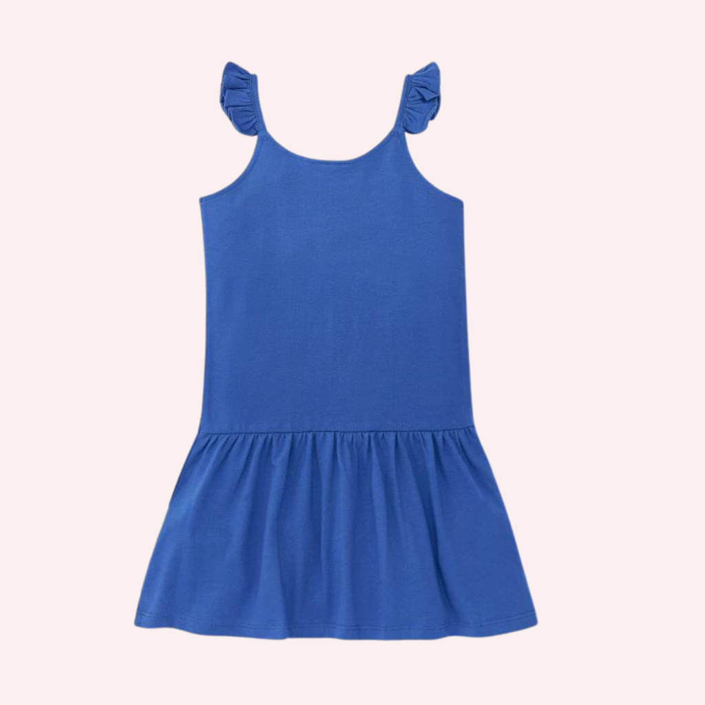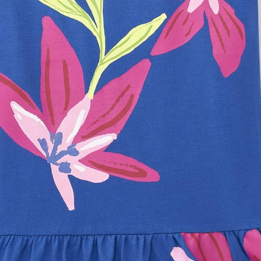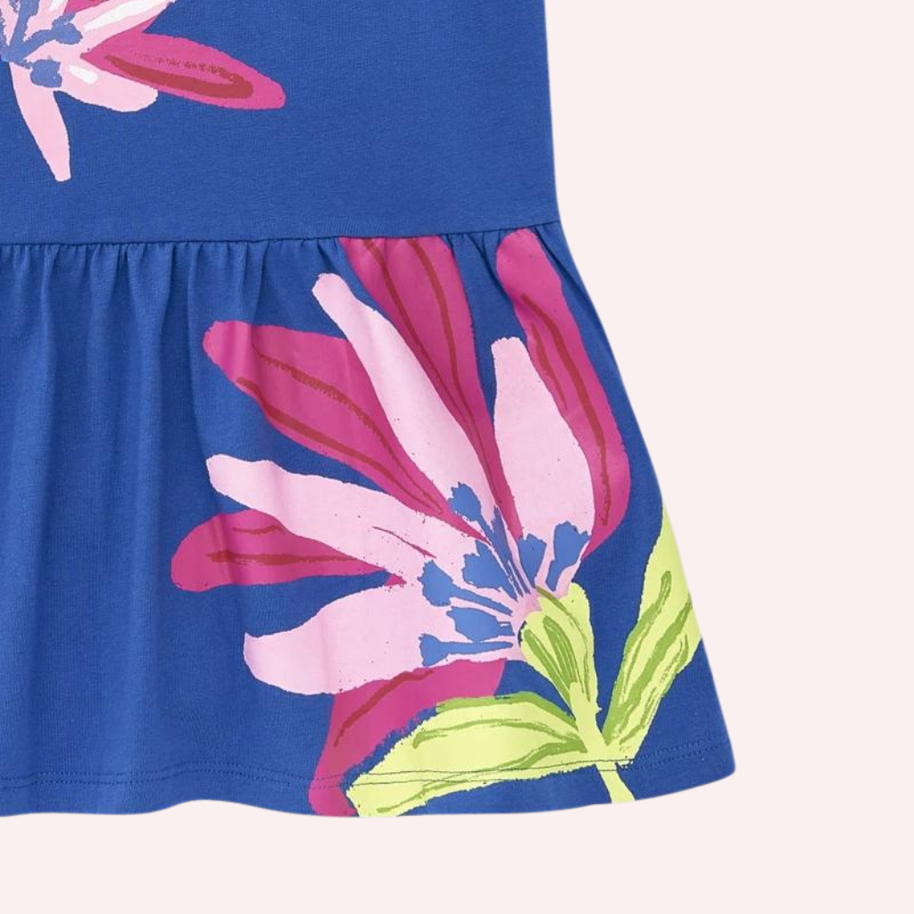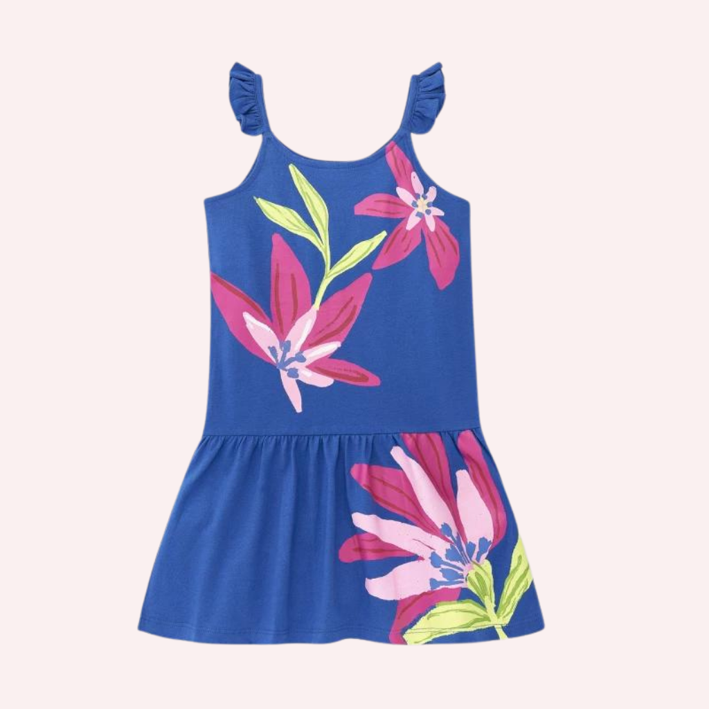 Blue knitted strap dress with flower print for girls. Collection Acid Bloom