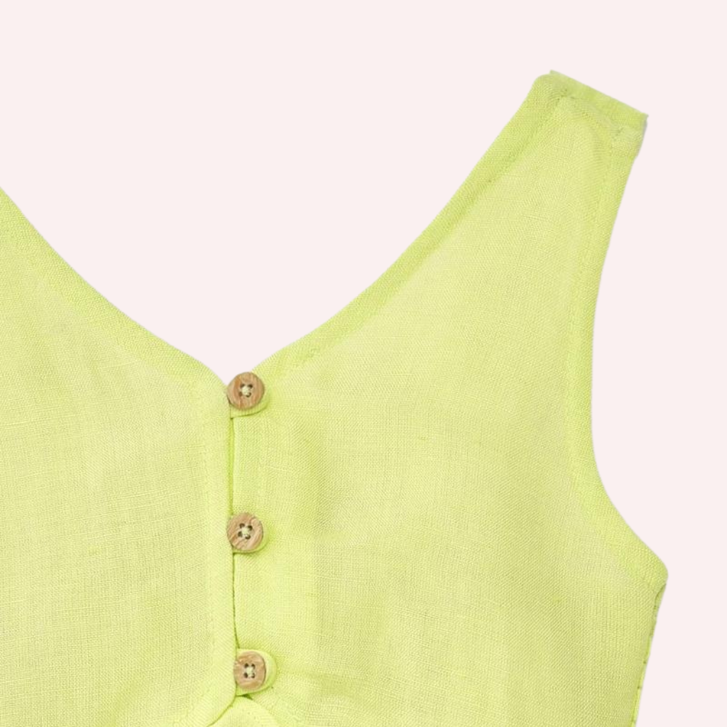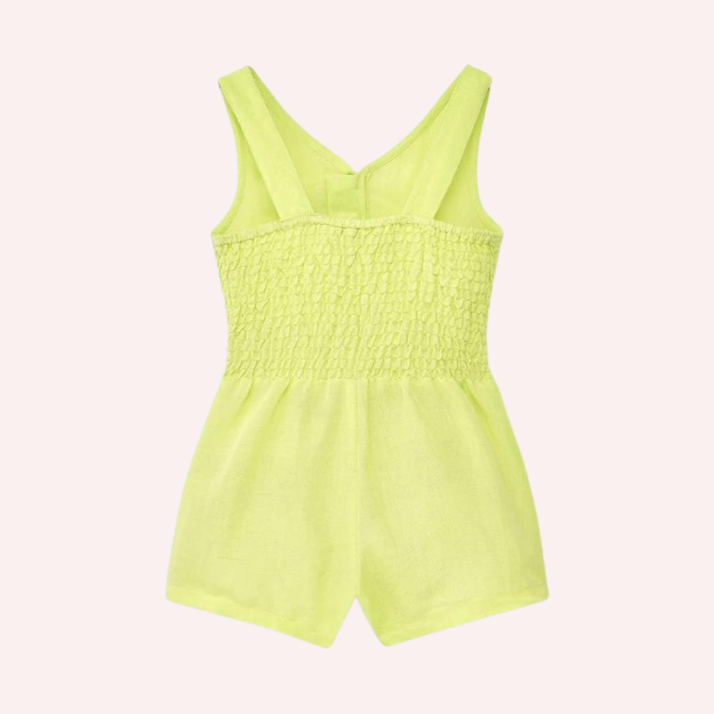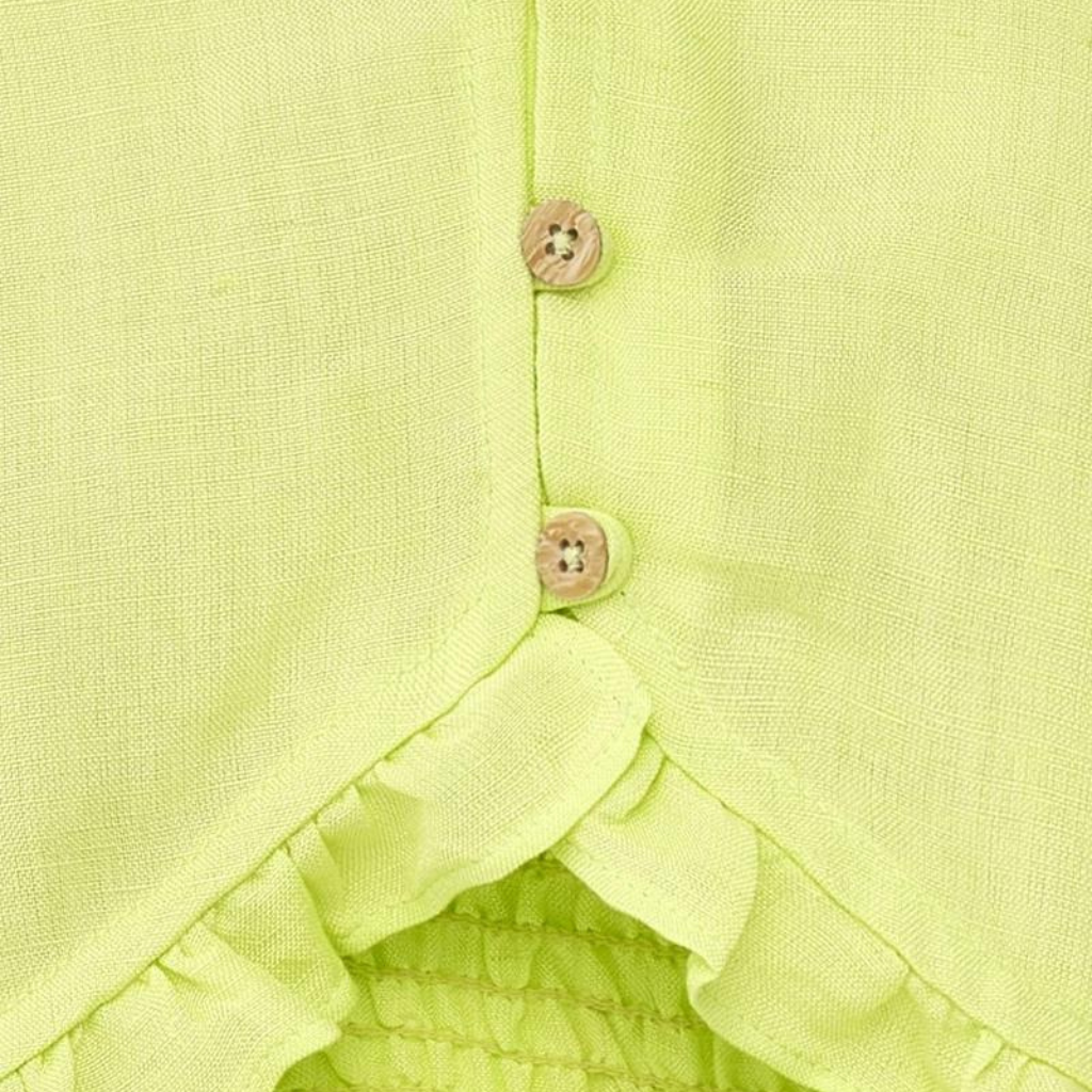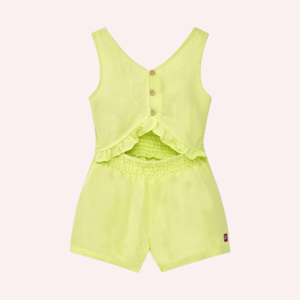 Green poplin jumpsuit with ruffle, front opening, elastic waist and button closure for girls. Collection Acid Bloom