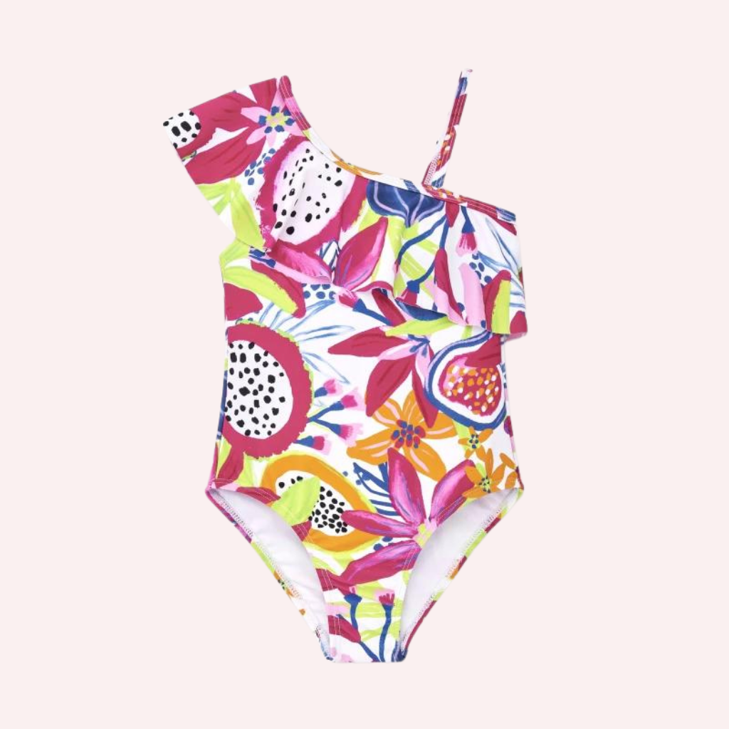 White Bathingsuit with colorful floral print and bow appliqué on the sides for girls. Collection Acid Bloom
