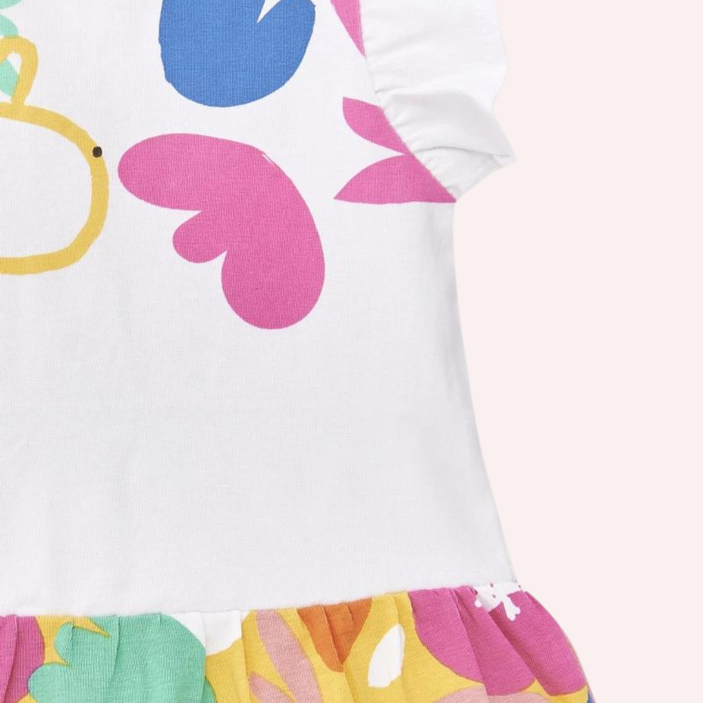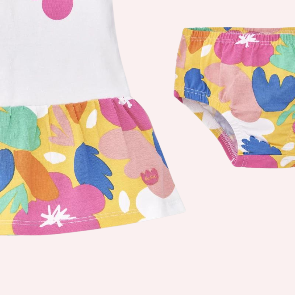 Two-piece knitted set for girls. White dress with giraffe print and colorful flowers. Pink briefs with colorful floral print. Collection Animal Life