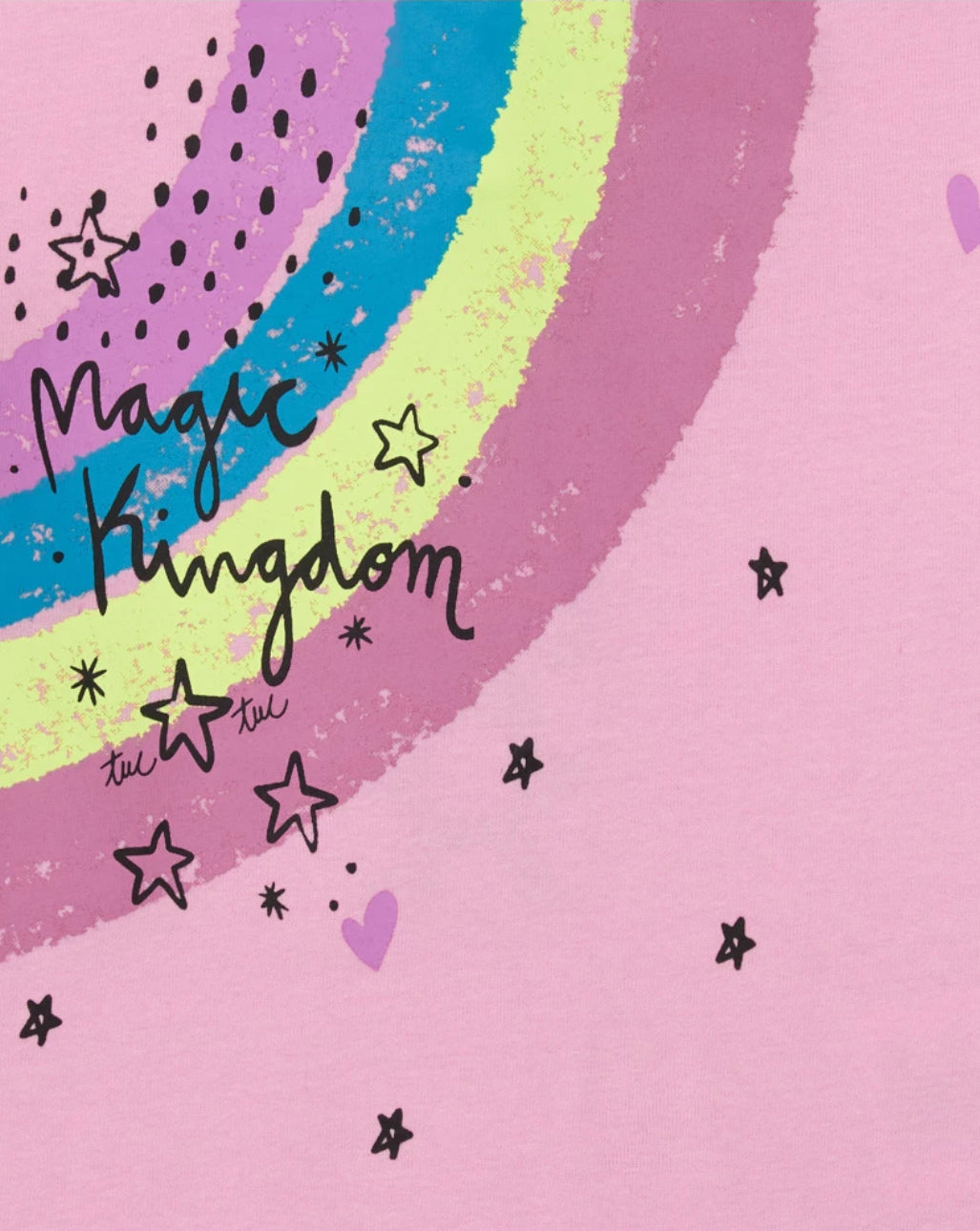 Conjunto Camiseta manga larga niña rosa claro. Presenta un estampado frontal de arcoíris en tonos vivos con detalles de estrellas, corazones y el texto “Magic Kingdom”. Falda Lentejuelas Tonos Rosa,Azul y Violeta