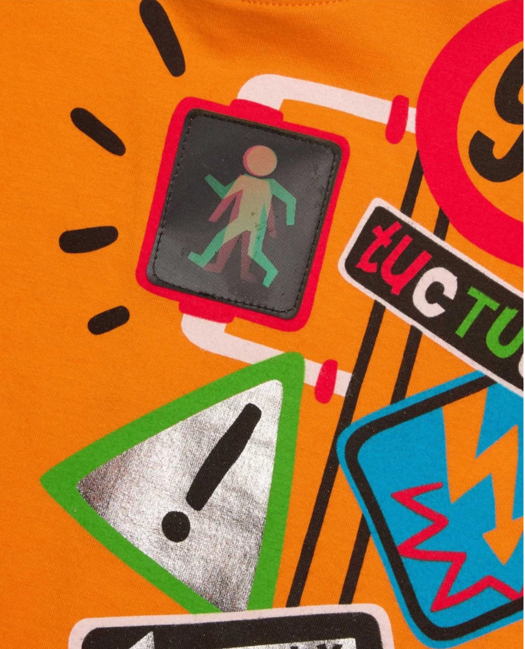 Conjunto Camiseta de manga larga. Color naranja vibrante con estampado frontal de señales de tráfico. Pantalón Largo efecto Denim desgastado Gris Oscuro Bolsillos Caargo Estampados Gráficos de Herramientas