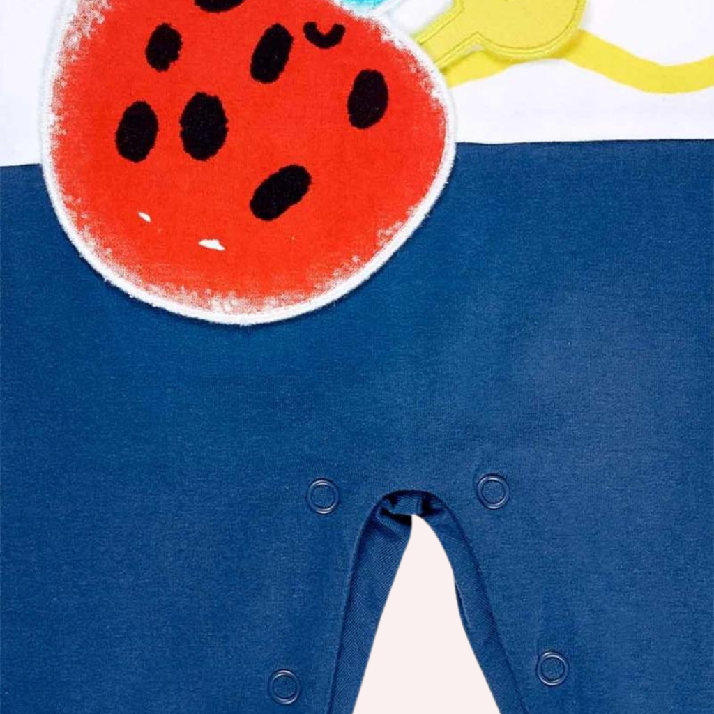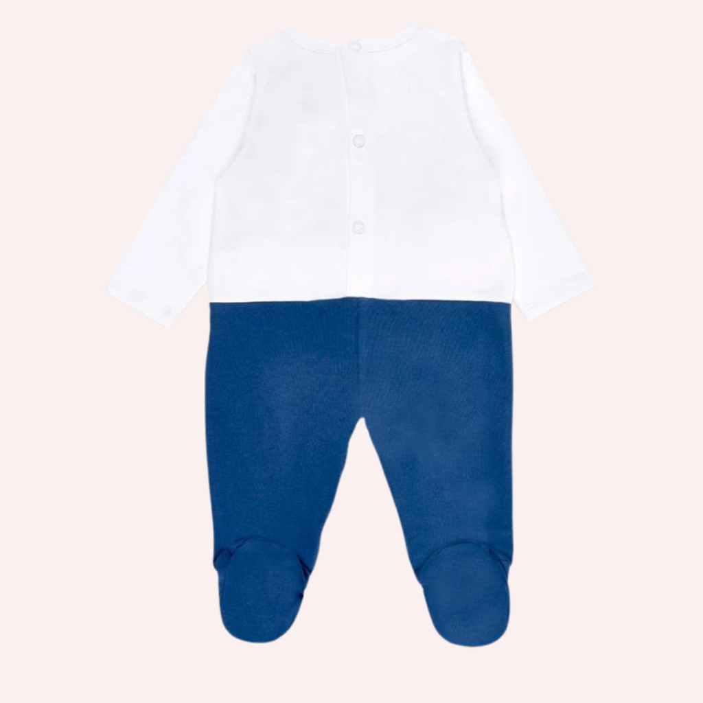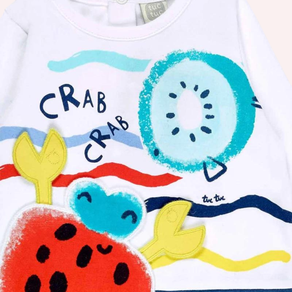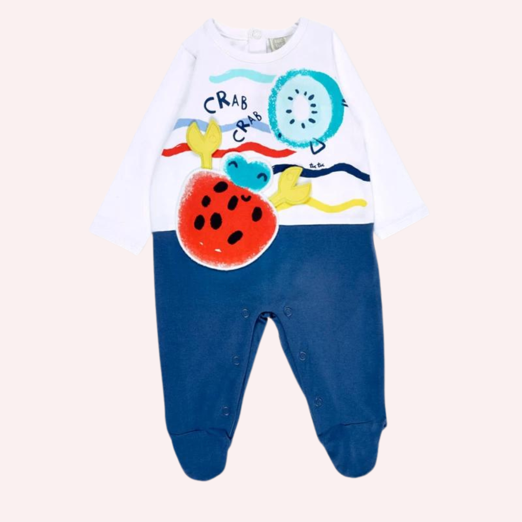 White and blue knitted romper with back opening and crab print for boys. Collection Frutti