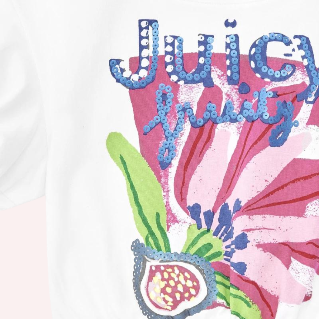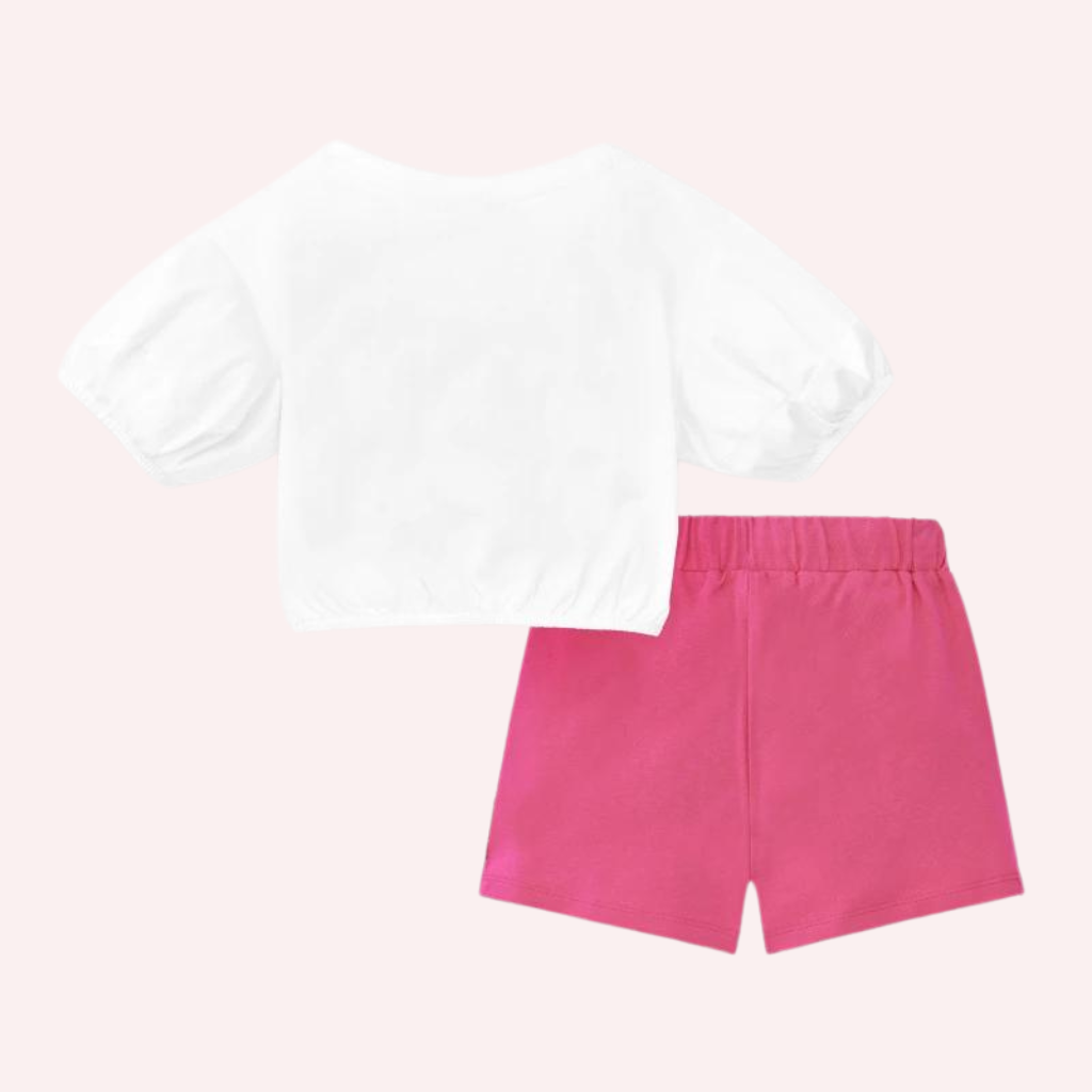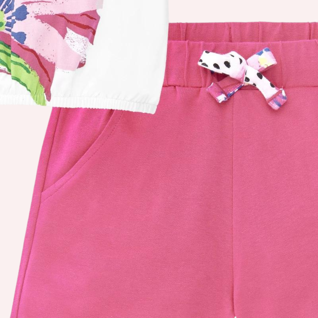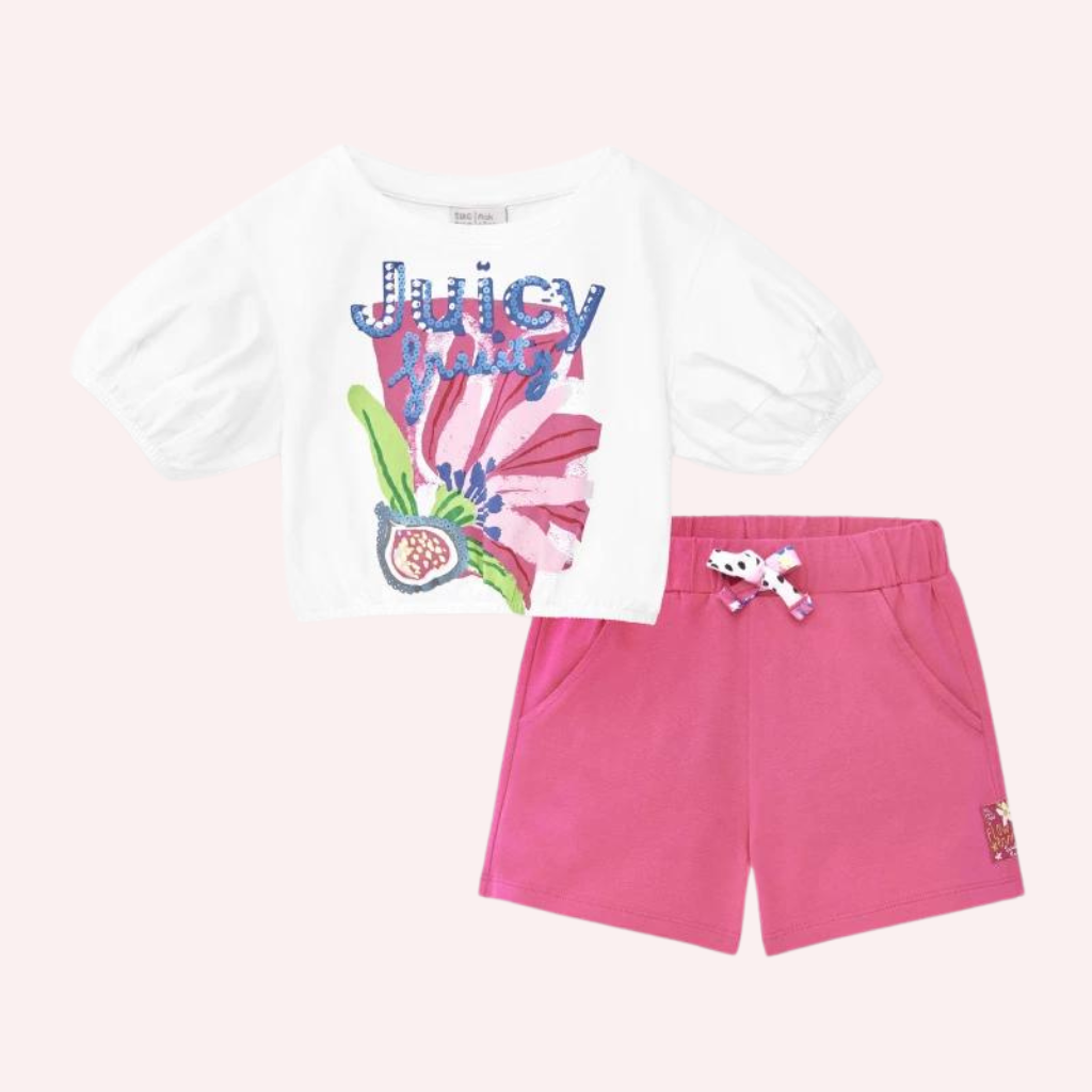 Two-piece knitted set for girls. White T-shirt with printed motif and gathered waist. Fuchsia pink shorts with elastic waistband and drawstring. Collection Acid Bloom