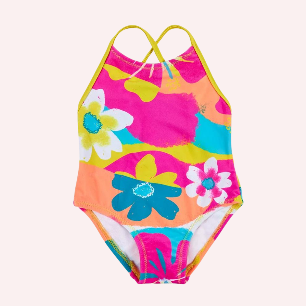 Fuchsia pink swimsuit with flower print for girls. Collection Laguna Beach