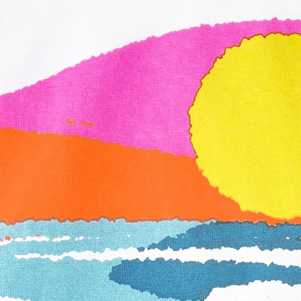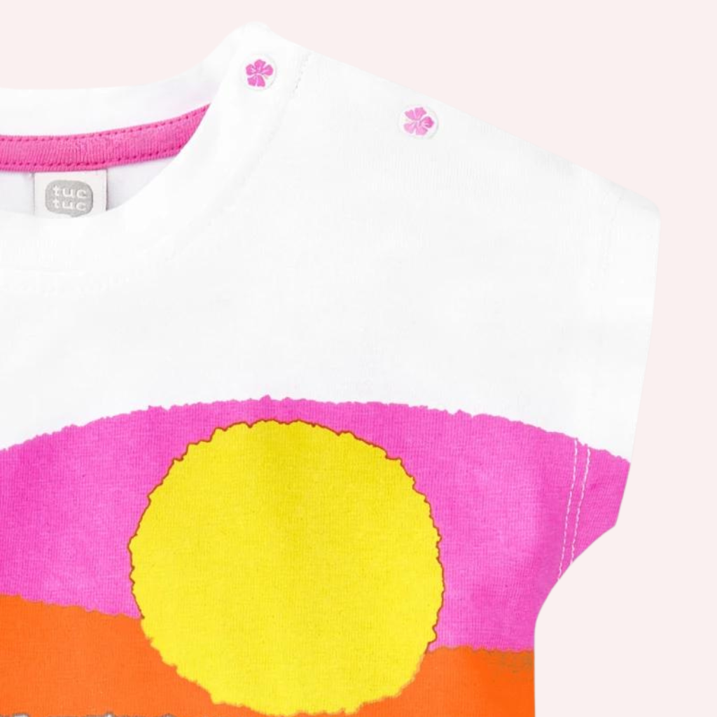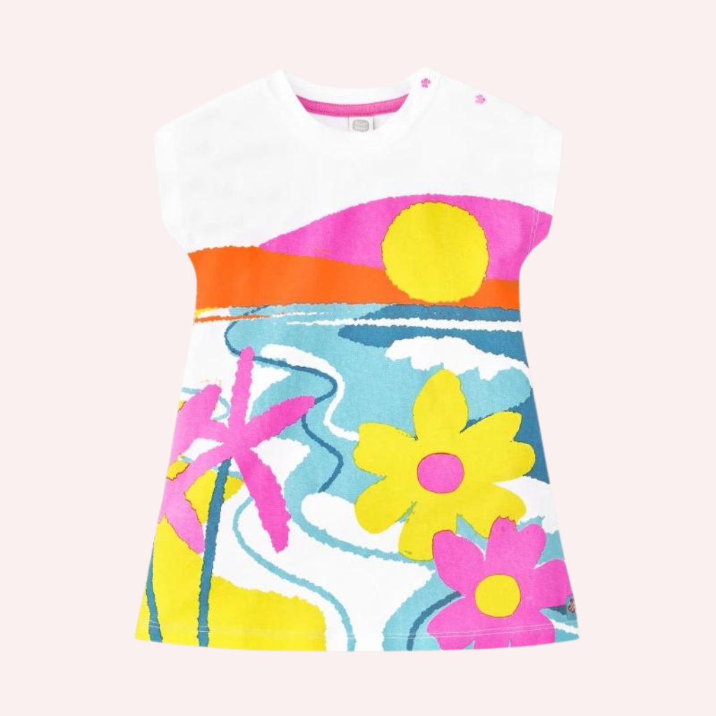White knit dress with beach print and buttons on the shoulder for girls. Collection Laguna Beach
