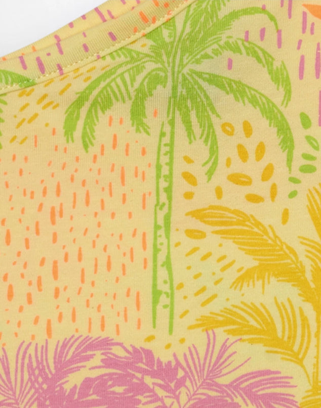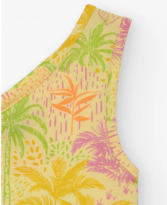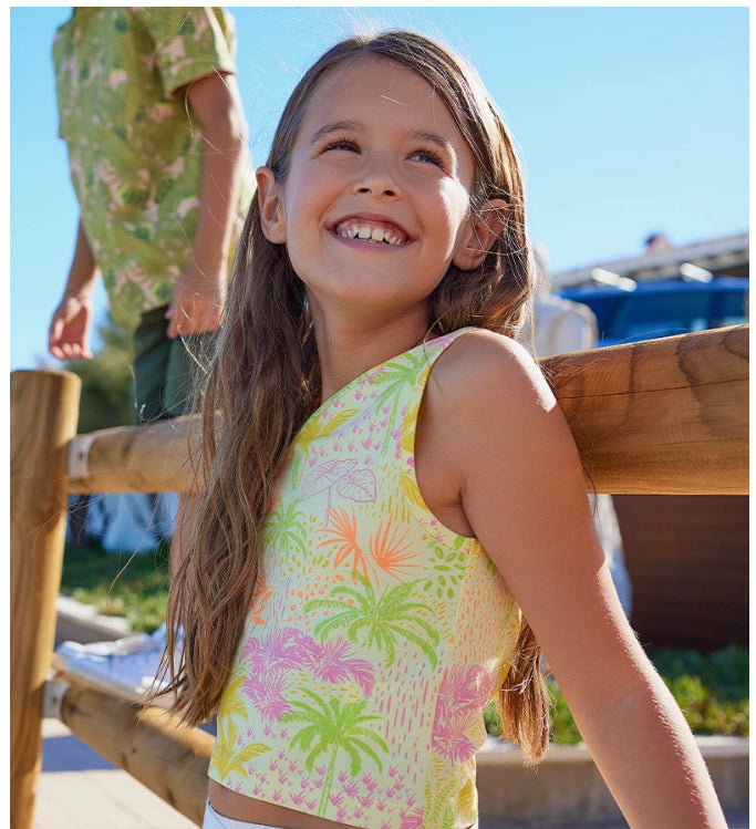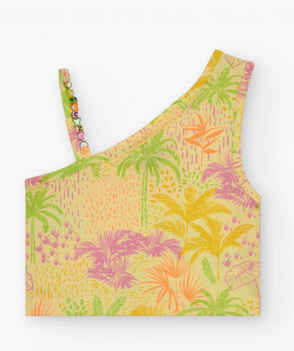 Top para niña de color amarillo con tropical y tirante decorado con cuentas de colores. Falda para niña en color amarillo, con estampado tropical de palmeras y plantas en tonos verdes, rosas y naranjas y cintura elástica.