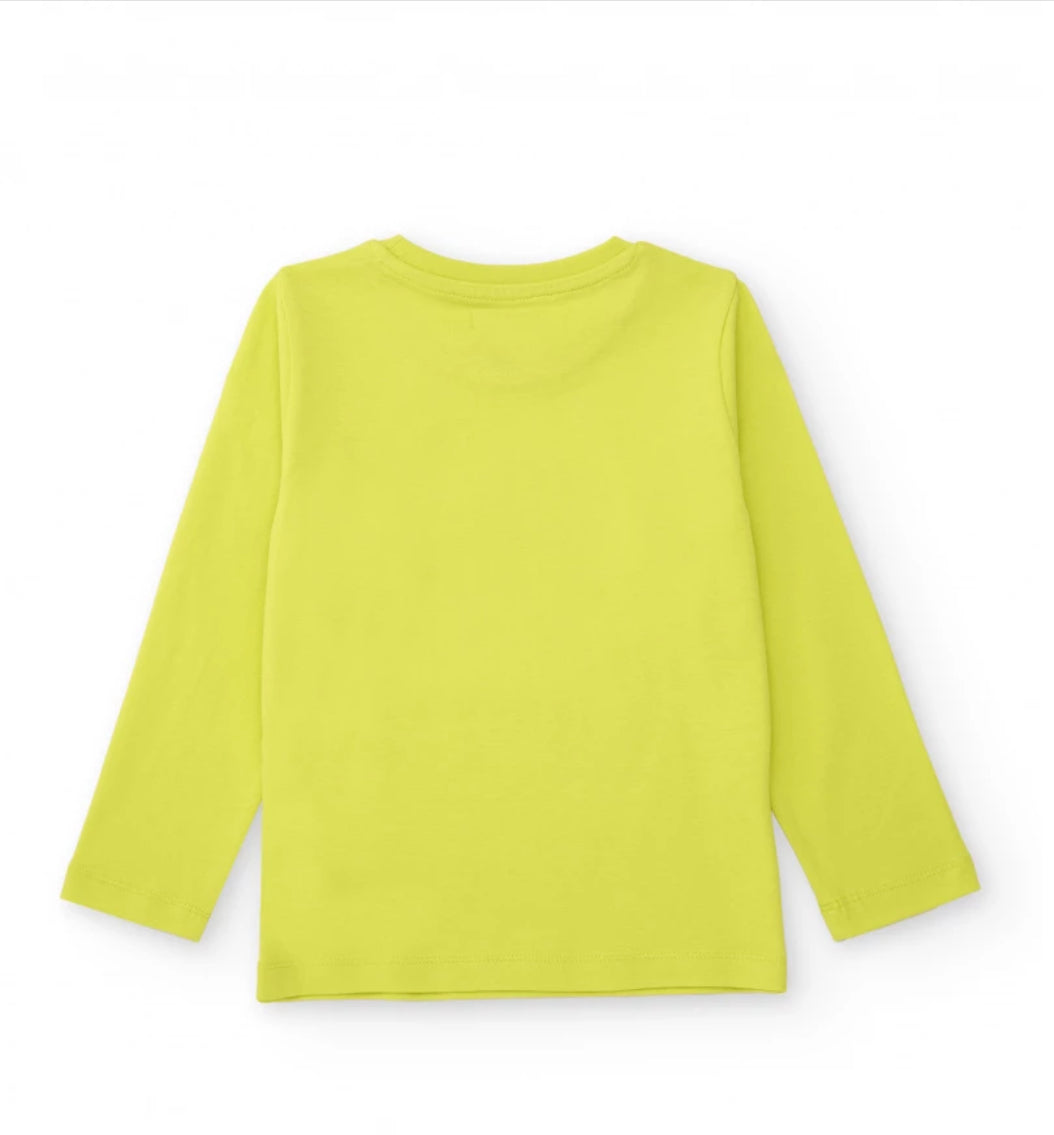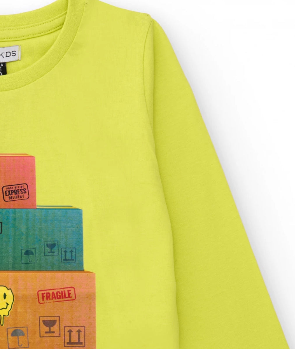Camiseta de manga larga para niño en color verde lima, estampado frontal de cajas y mensajes gráficos como "Confidential", "Fragile" y "Express Delivery".