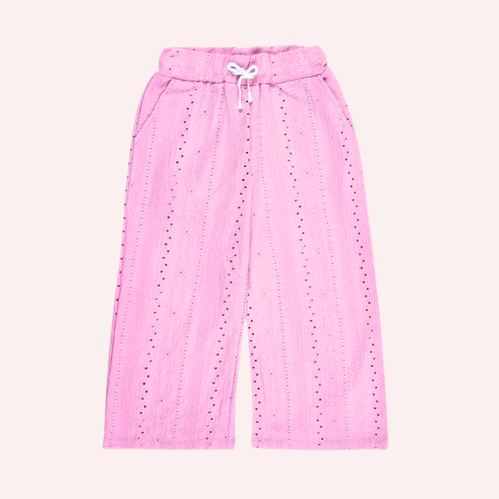 Pink openwork knit pants with pockets, elastic waist and drawstring for girls. Collection Carnet De Voyage KG06P601P5