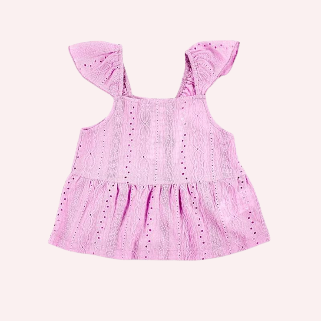 Pink openwork knit top with ruffles on the sleeves for girls. Collection Carnet De Voyage. KG06T602P5