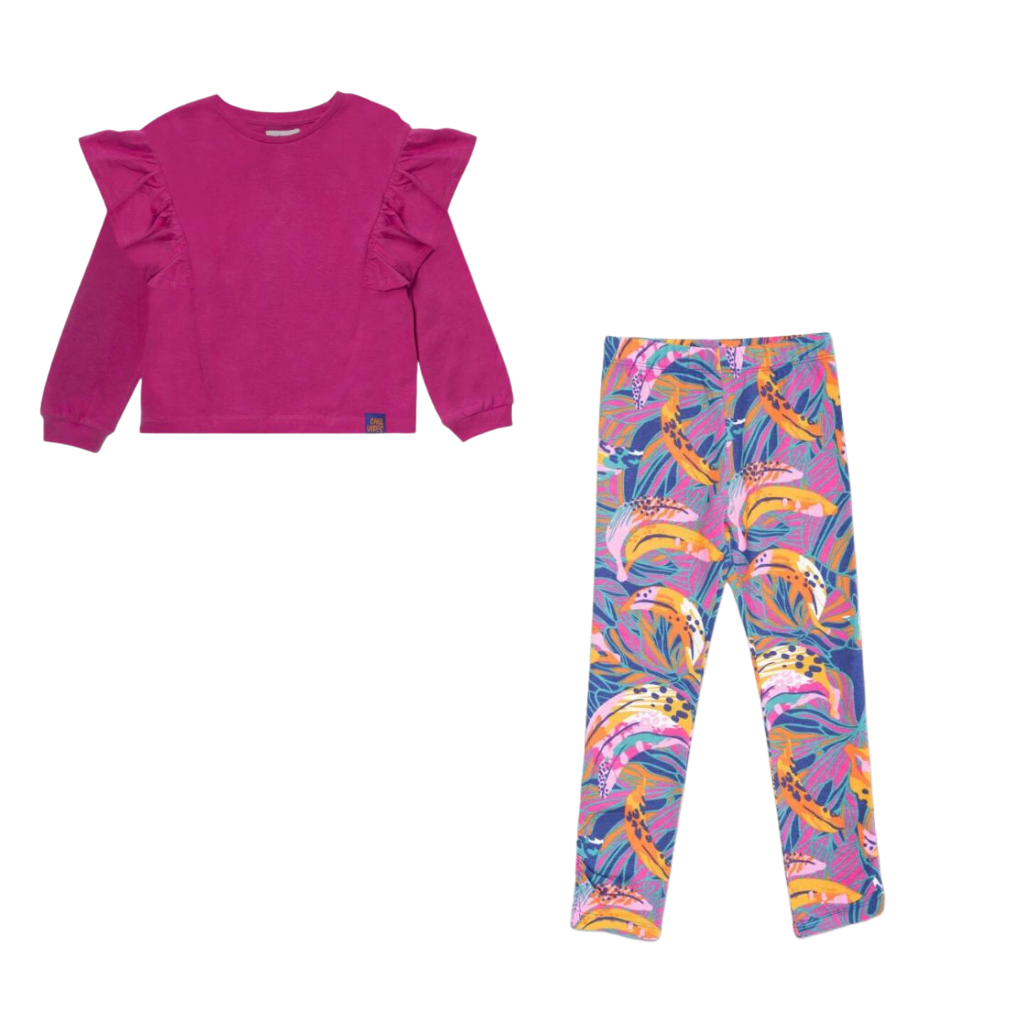 Purple long-sleeved knitted t-shirt with frill appliqué for girl. Long knitted leggings with colorful banana print for girls. NATHKIDS Full Bloom Collection.