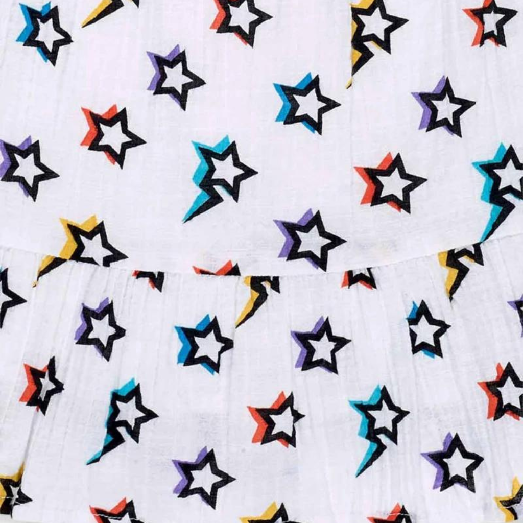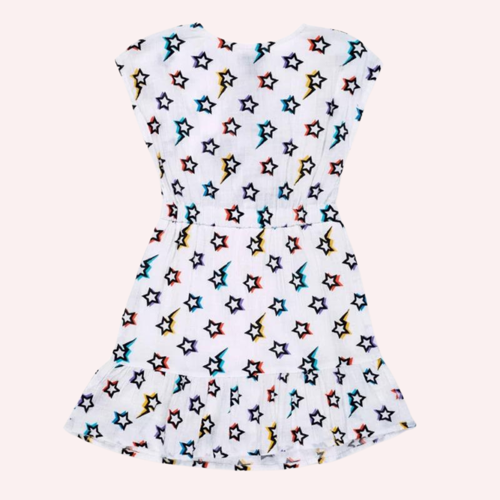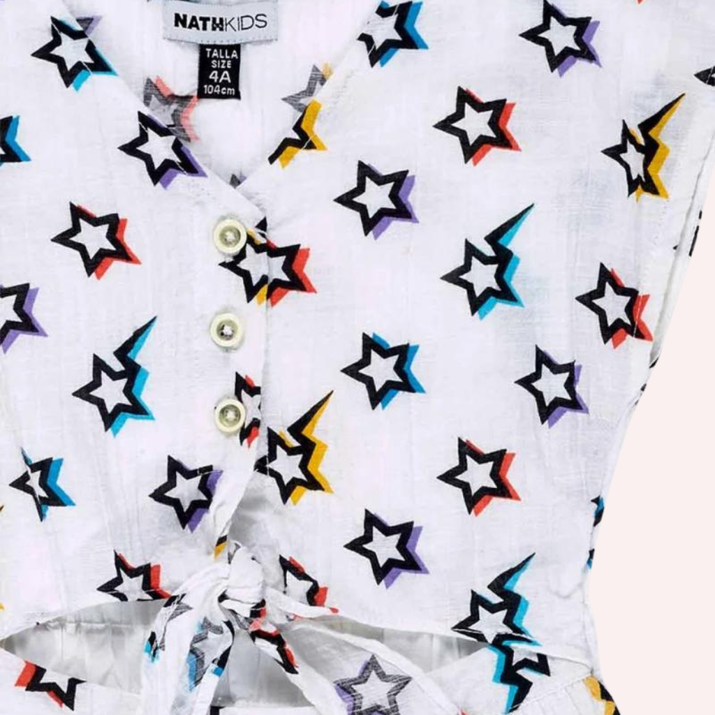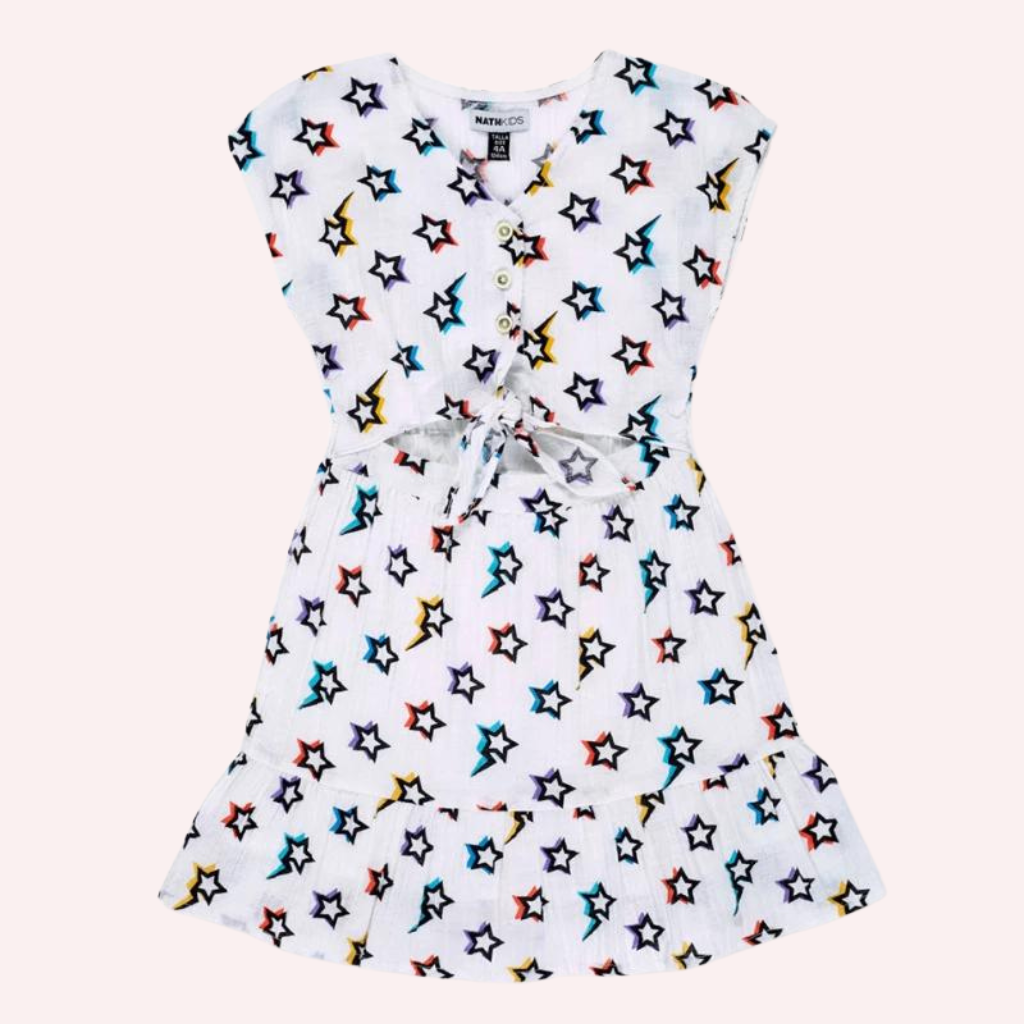 White knit dress with star print and knot at the waist for girls. Collection Summer Vibes