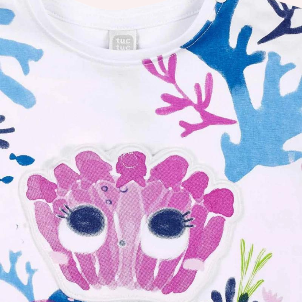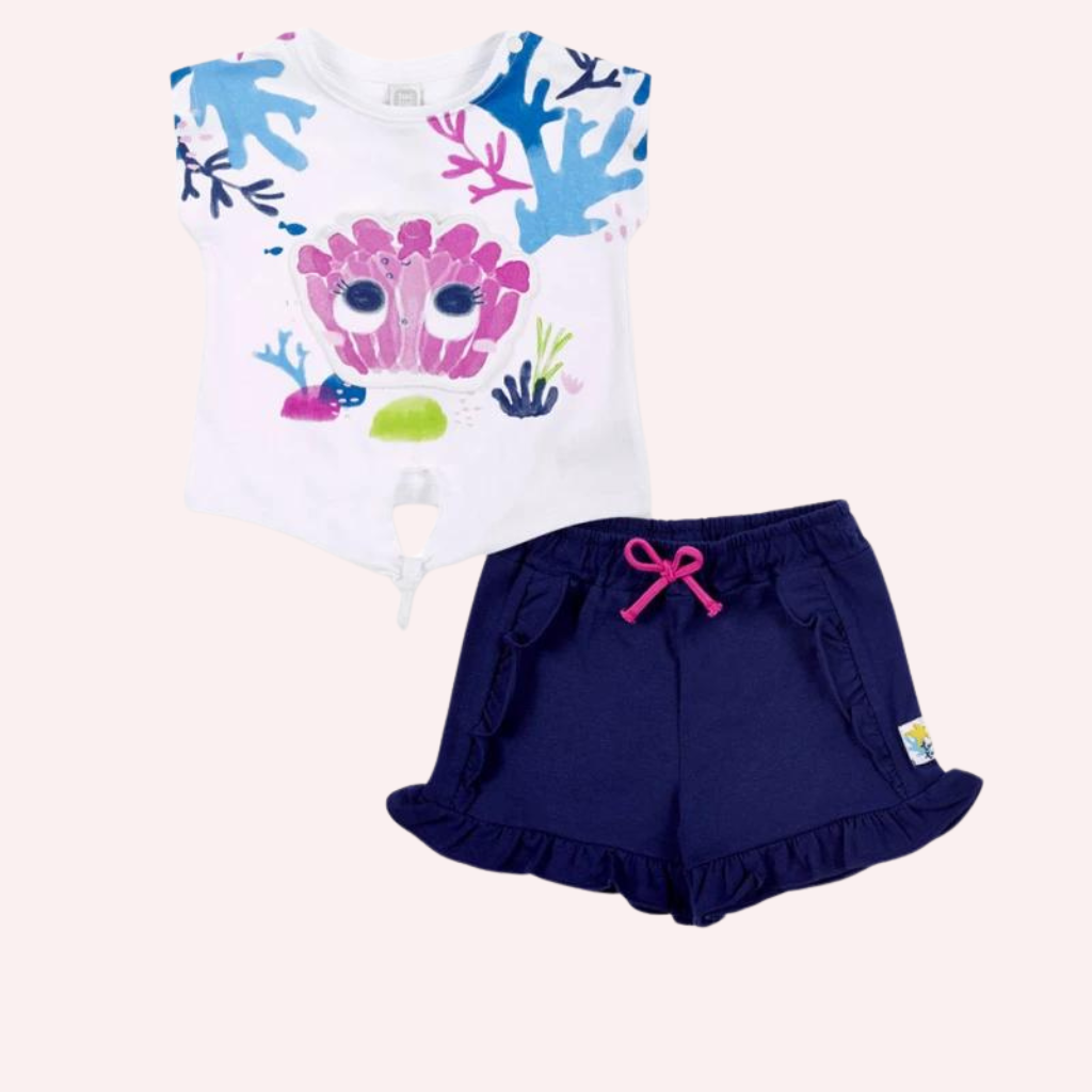 Two-piece knitted set for girls. White t-shirt with seaweed print. Navy blue shorts with pockets, ruffles, elastic waist and drawstring. Ocean Wonders collection Ocean Wonders collection