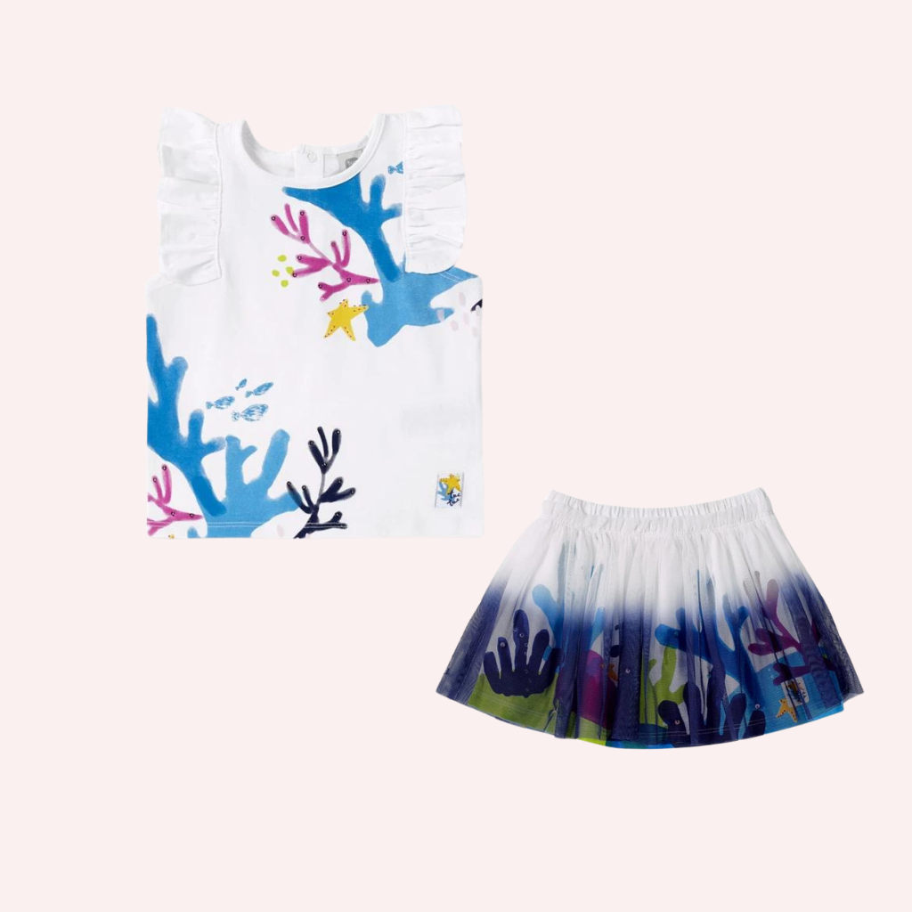 Blue knit and tulle skirt with seaweed print for girls. Ocean Wonders collection Ocean Wonders collection