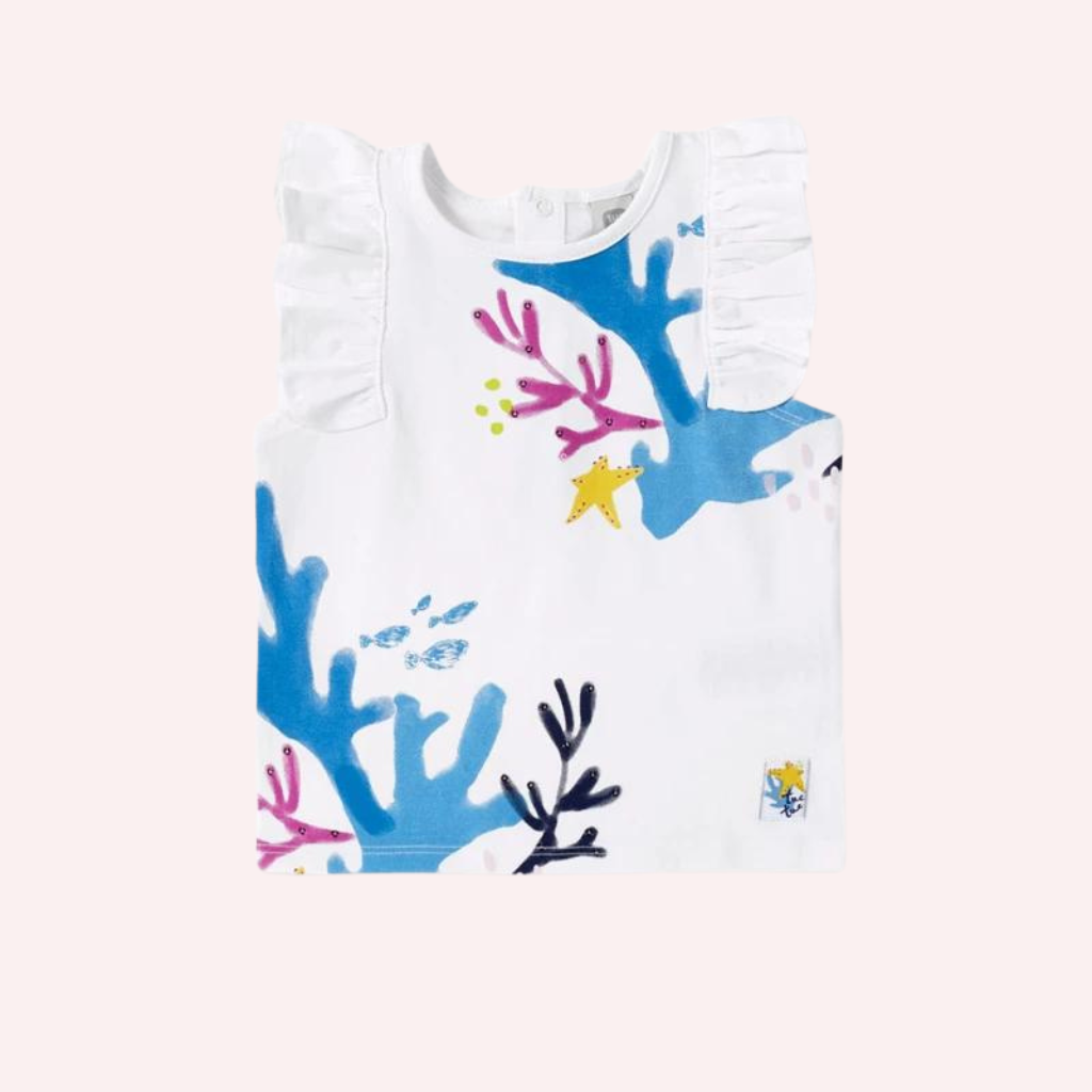 White knit t-shirt with seaweed print and ruffles on the straps for girls. Ocean Wonders collection Ocean Wonders collection