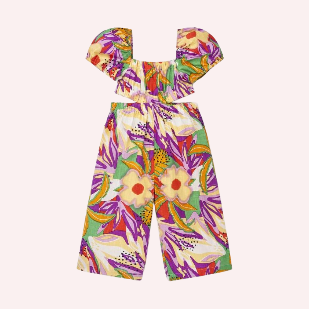 Orange poplin jumpsuit with floral print for girls. Collection Paradise Beach