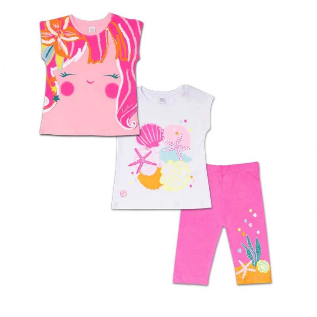 Knitted set, three pieces for girl. White t-shirt with colorful marine print. Pink t-shirt with fuchsia print. Fuchsia pirate leggings with seabed detail on one leg. Seashell Collection.