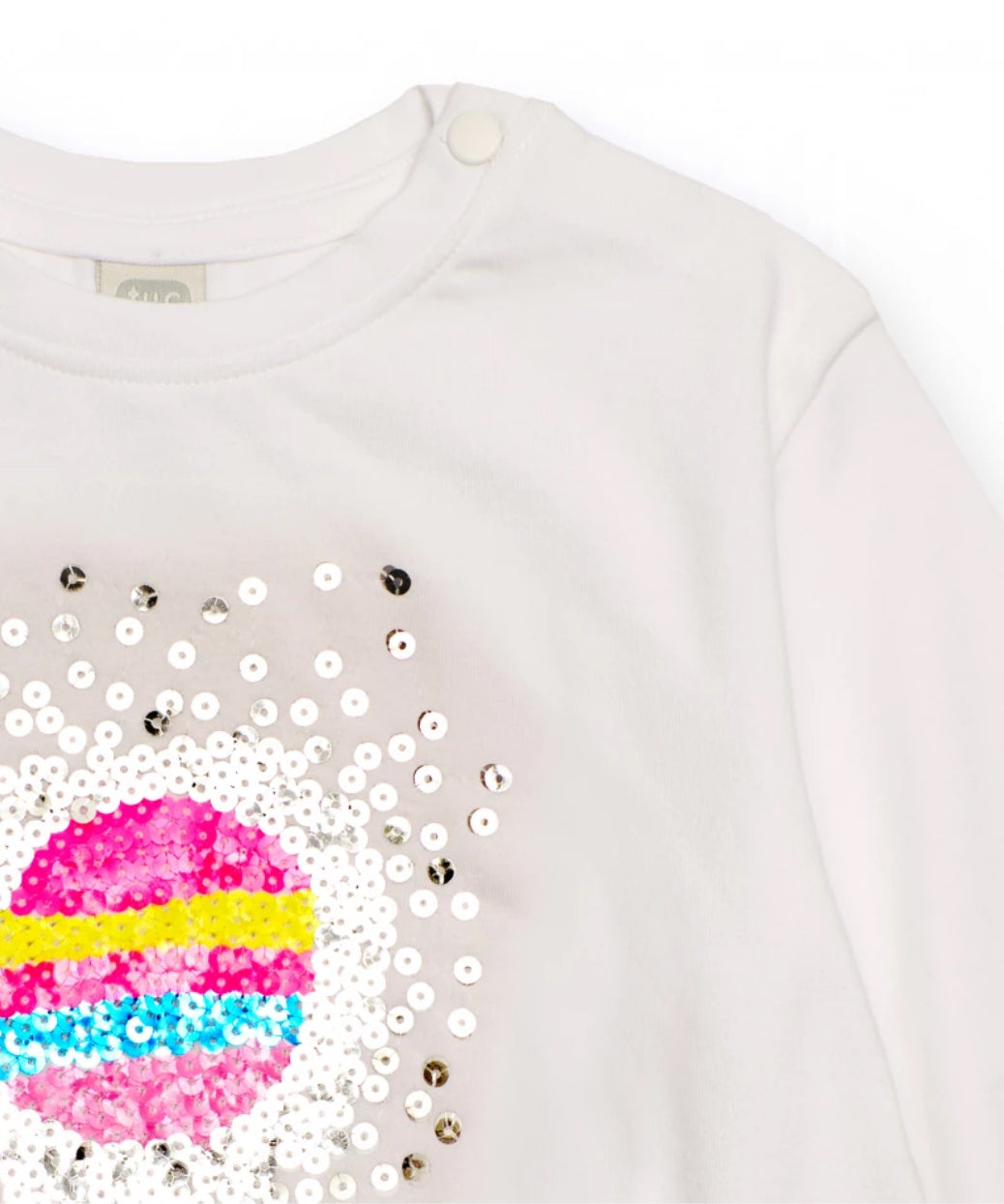 conjunto Sudadera de felpa para niña en color blanco con un llamativo diseño de lentejuelas en forma de planeta multicolor en el frente. Pantalones Mezclilla Azul Claro