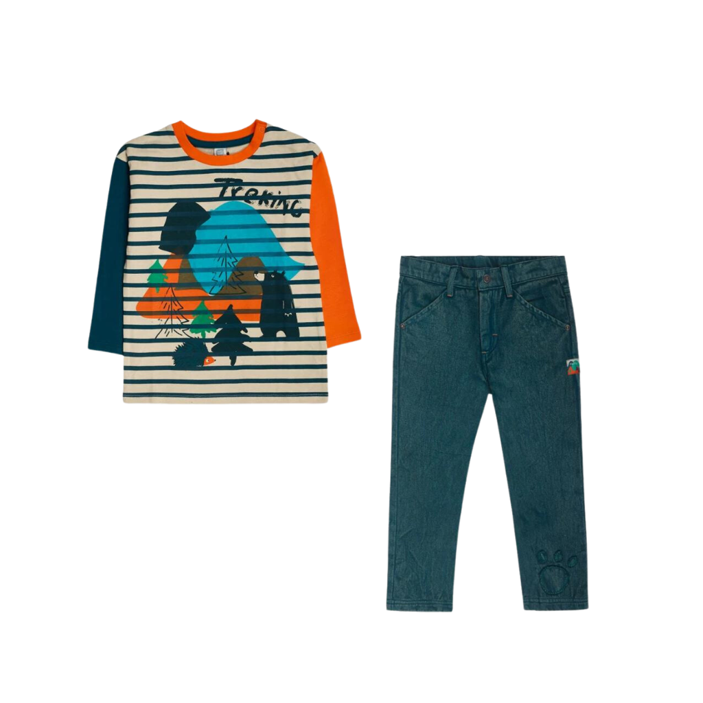 Orange knitted t-shirt with mountain and striped print and Green twill pants with front pockets and zip closure with button for boys. Trekking Time Collection.