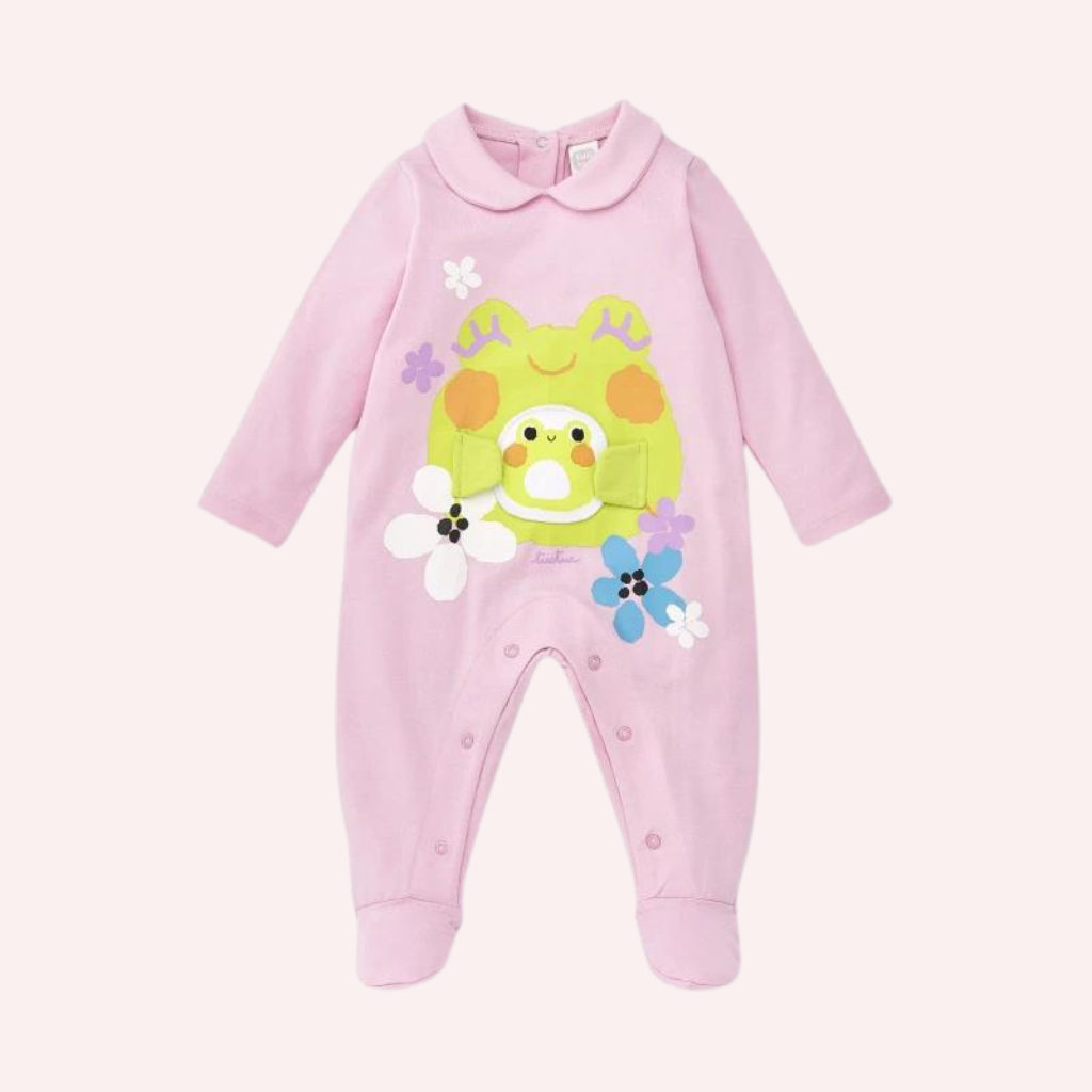 Pink knit romper with green frog print, baby-type collar and back opening for girls. Collection Water Lilies