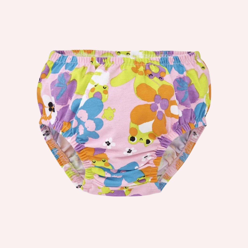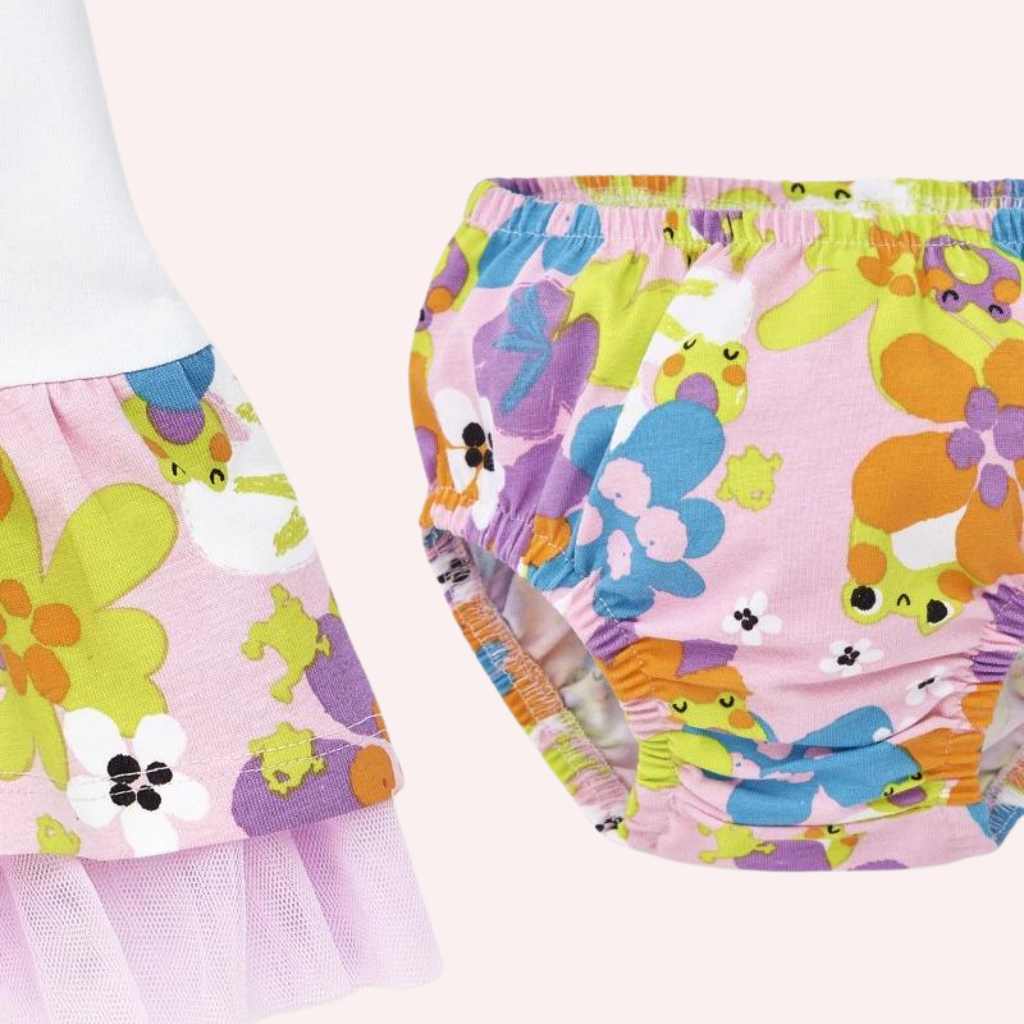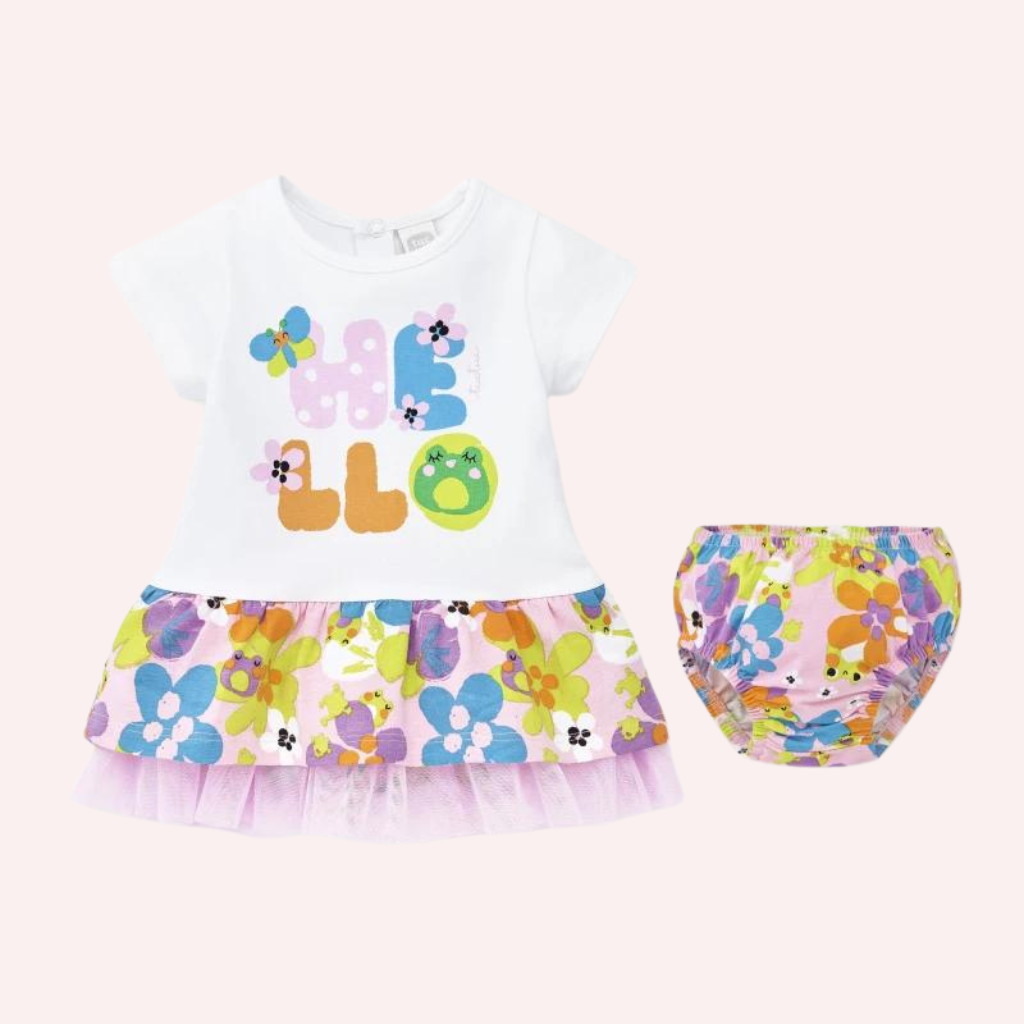 Knit and tulle set, two pieces for girls. White dress with 'Hello' sign and printed skirt with pink tulle. Pink briefs with colorful floral print and elastic waist. Collection Water Lilies