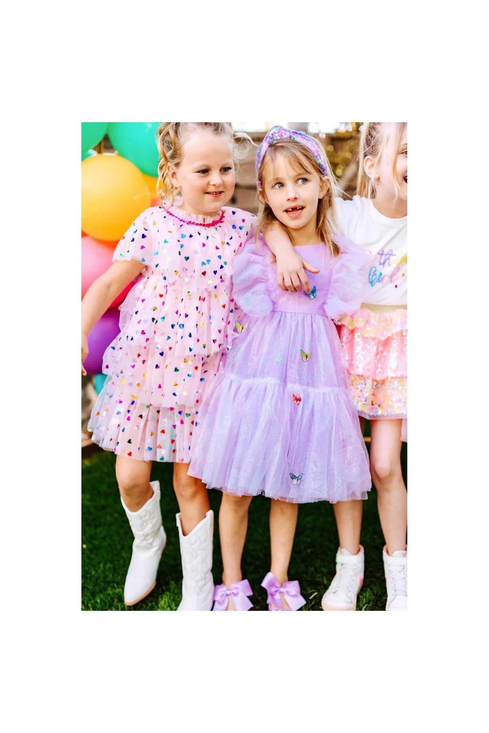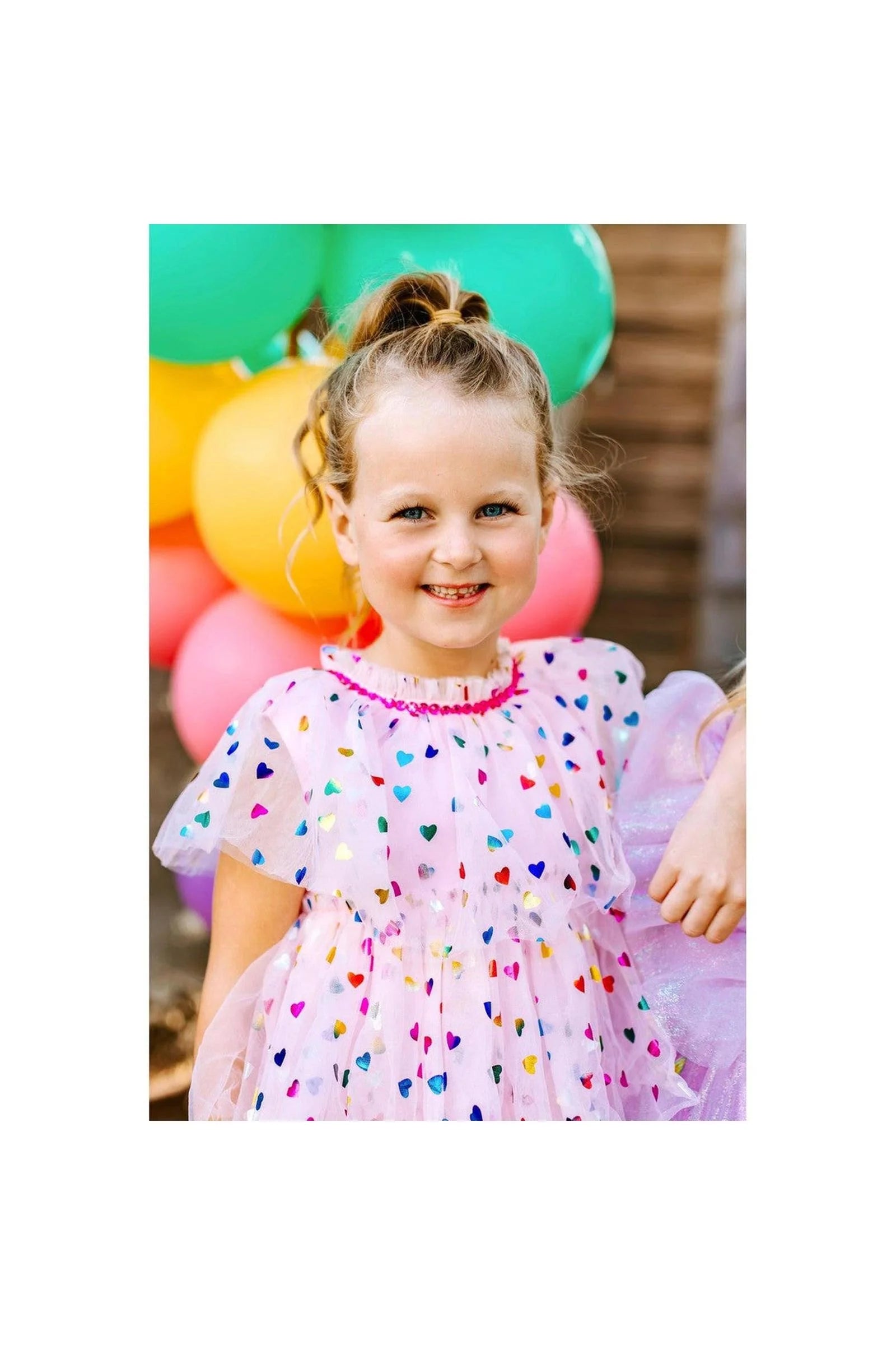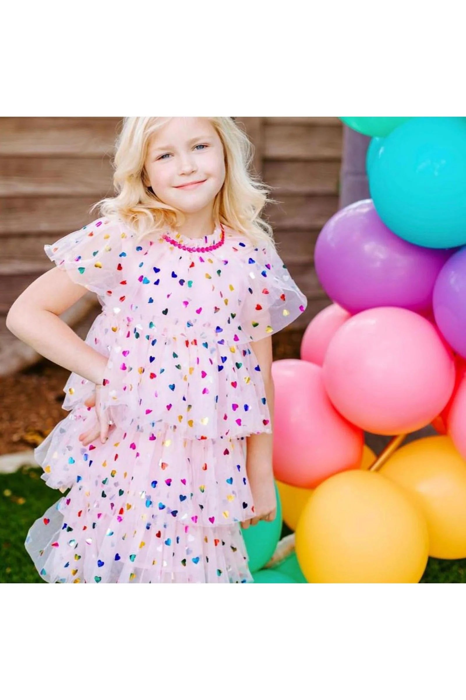 Vestido Niña Tulle Rosa con 4 Layers y Estampado Corazones en Colores Metallico